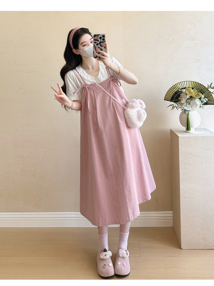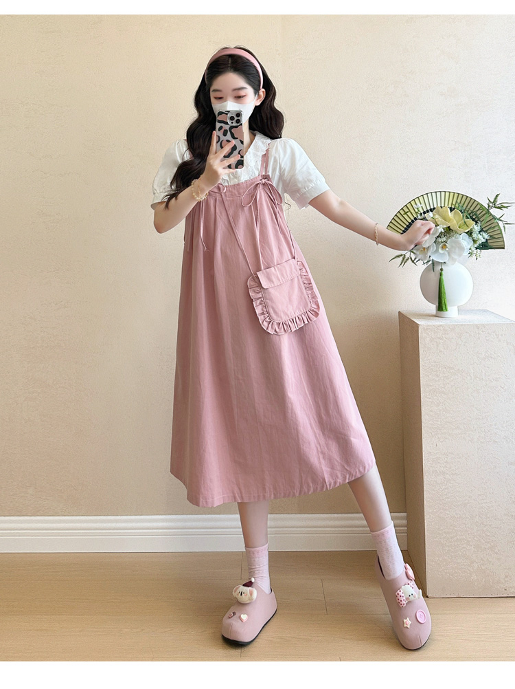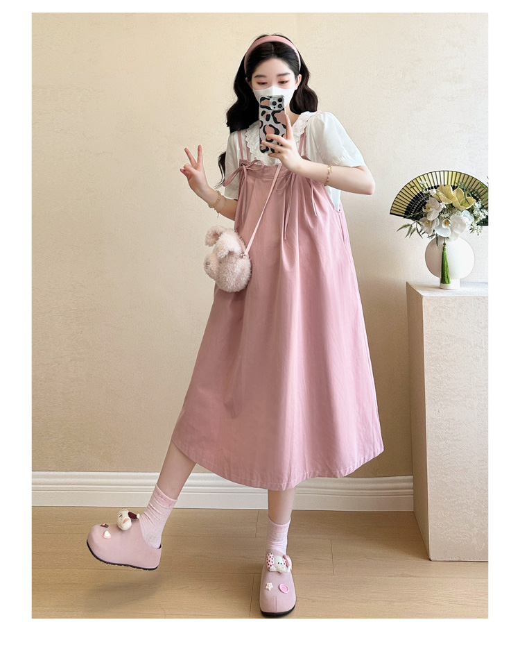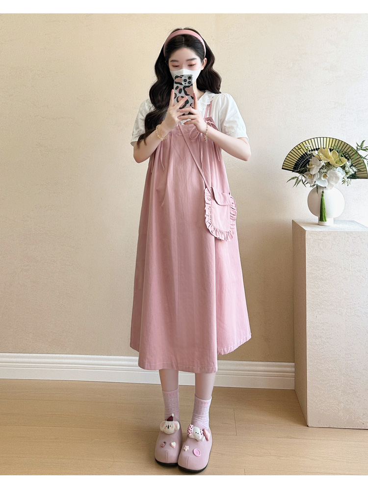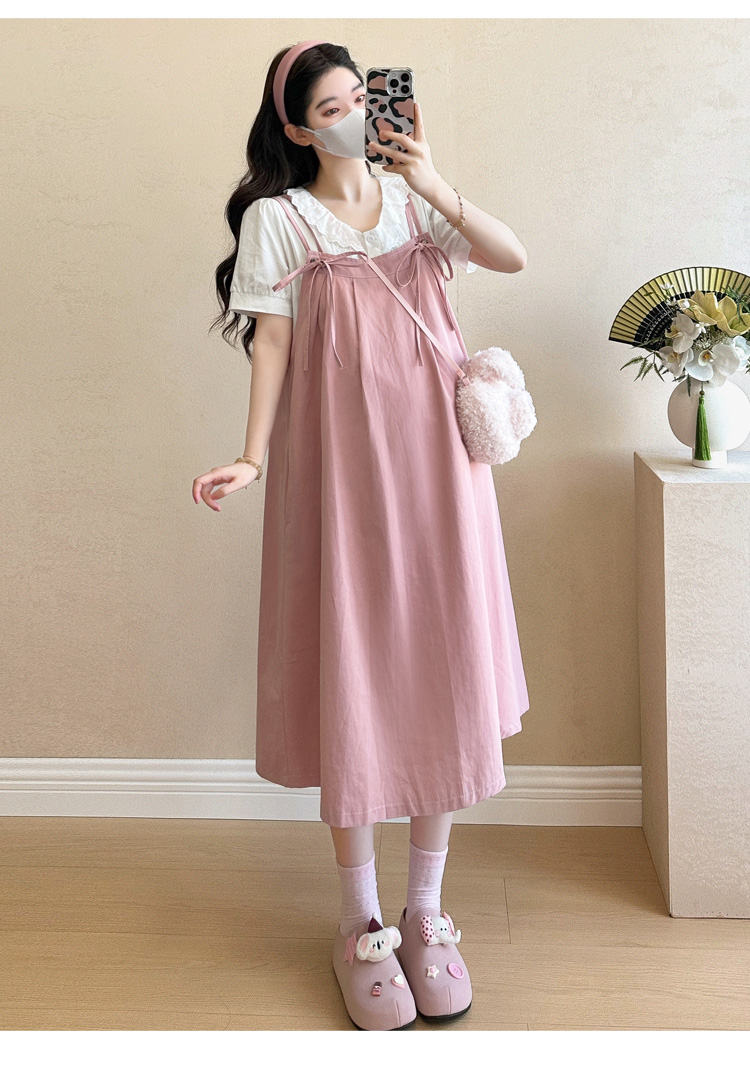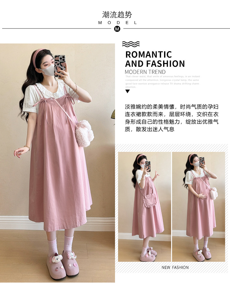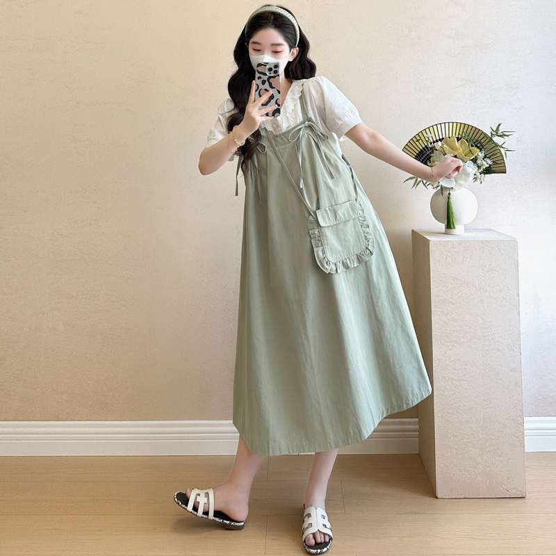 실사 빅 사이즈 출산 착용 순면 임산부 멜빵 스커트 순면 셔츠 투피스 세트 한국 스타일 임산부 세트