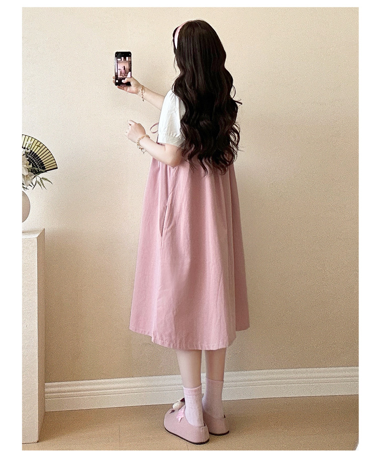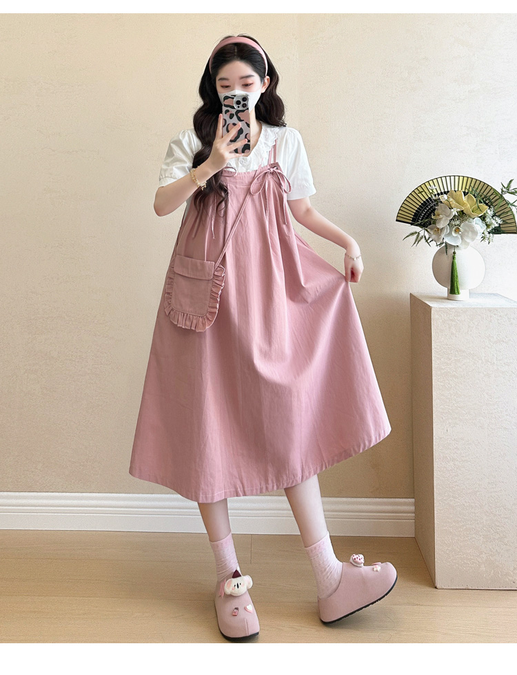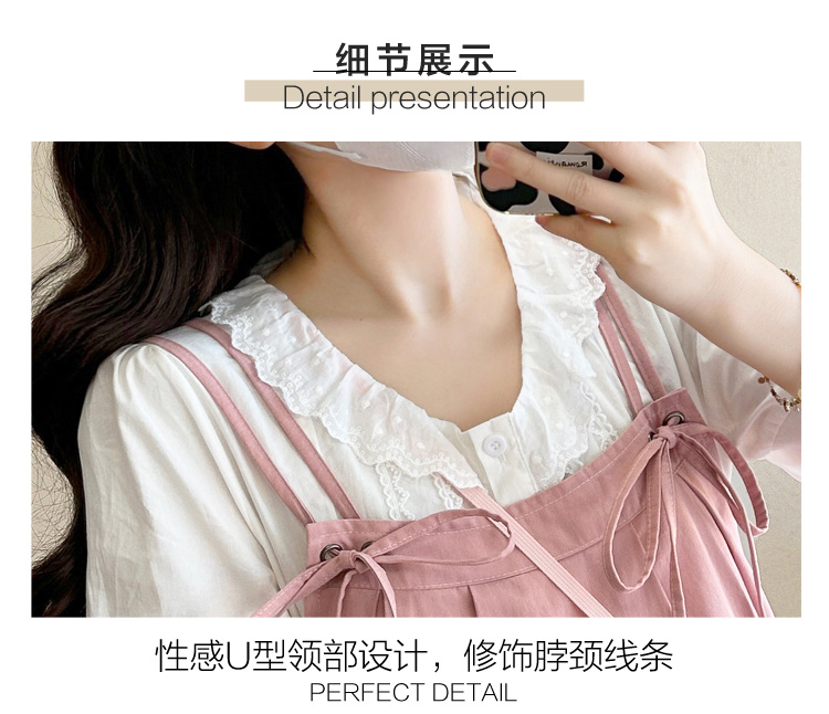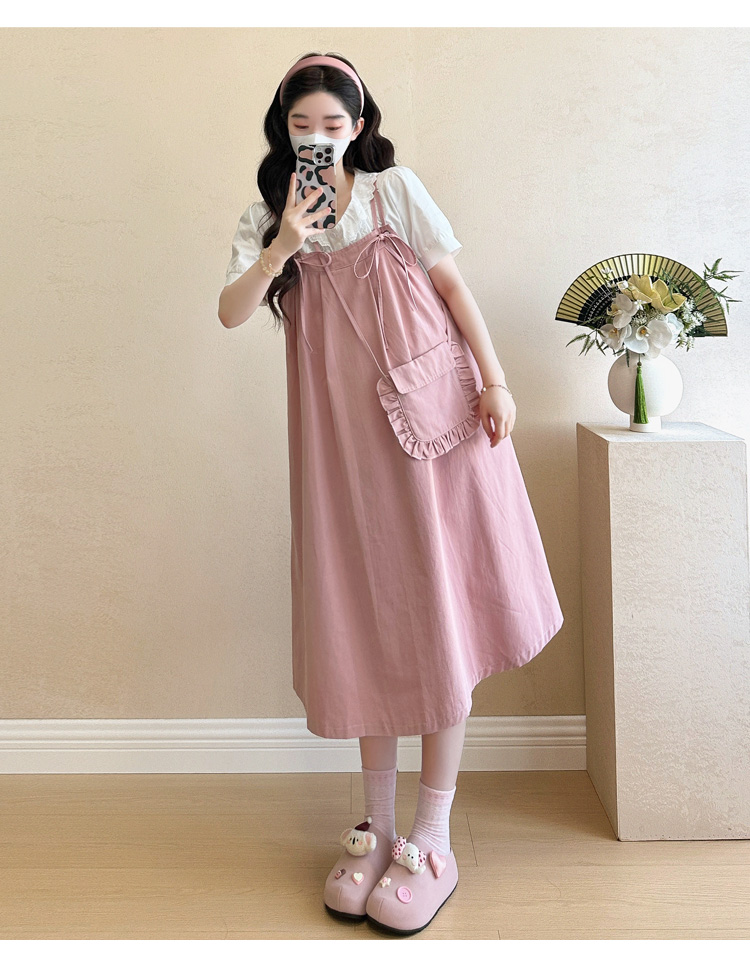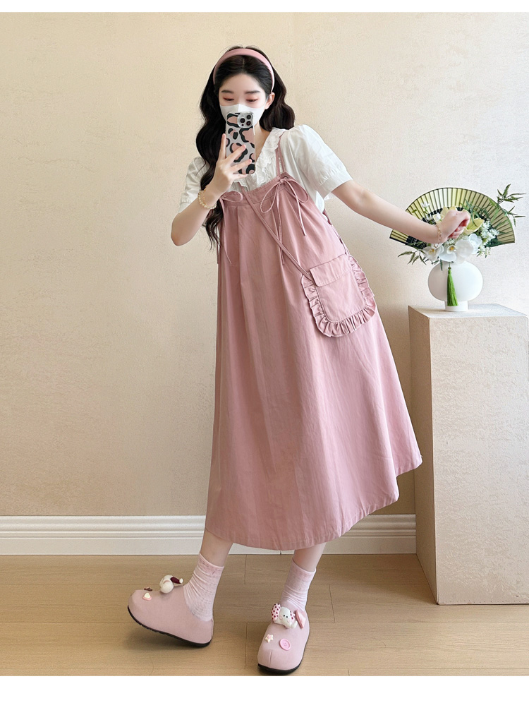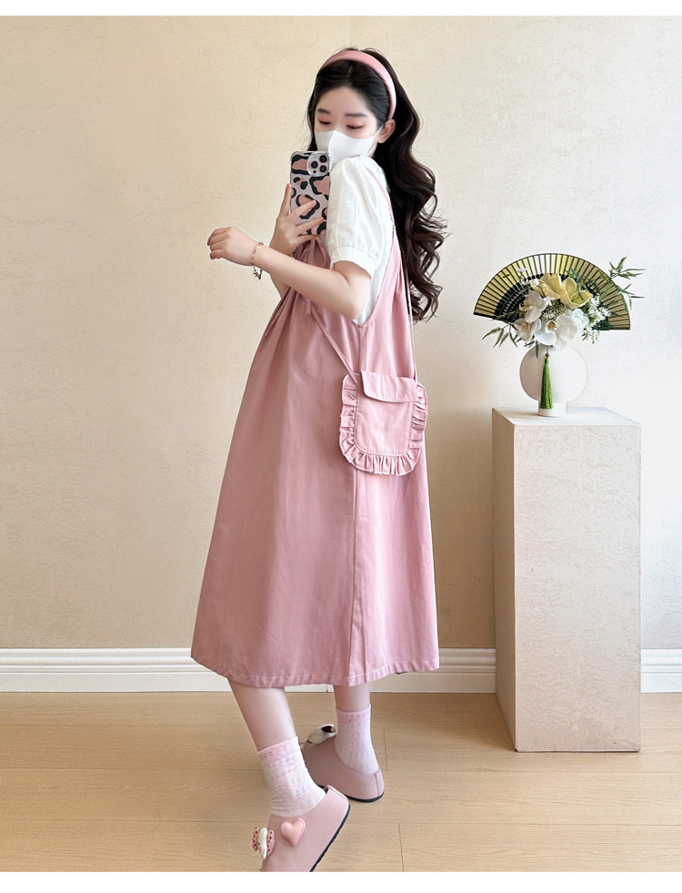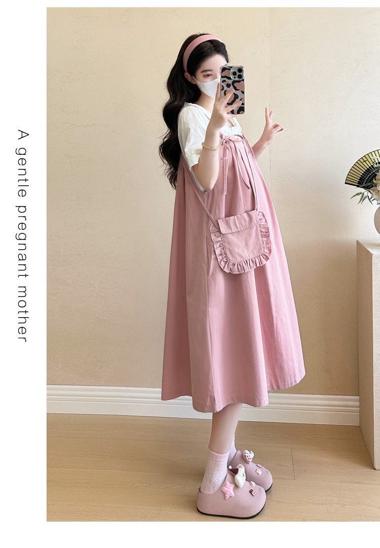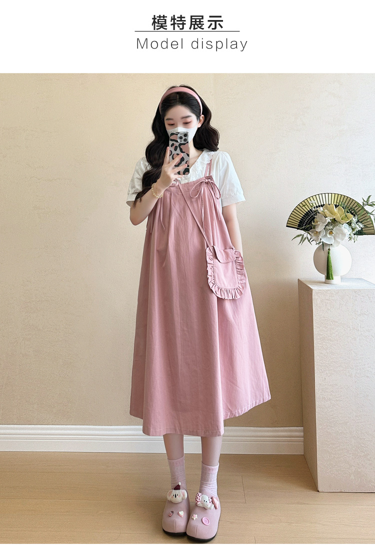 실사 빅 사이즈 출산 착용 순면 임산부 멜빵 스커트 순면 셔츠 투피스 세트 한국 스타일 임산부 세트