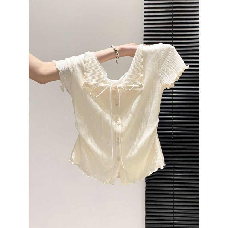 한 부서 u 칼라 작은 날다 소매 반팔 티셔츠 여성 여름 새로운 Chic 디자인 센스 허리 수축 몸매 가꾸기 쇼트 스타일 그레이트 봐. 의류