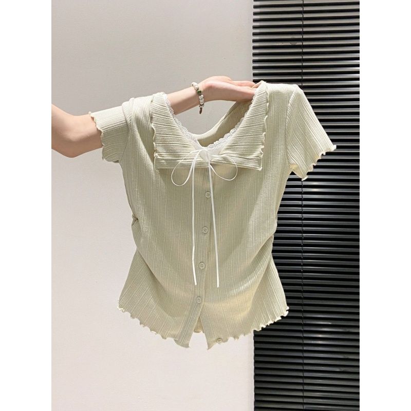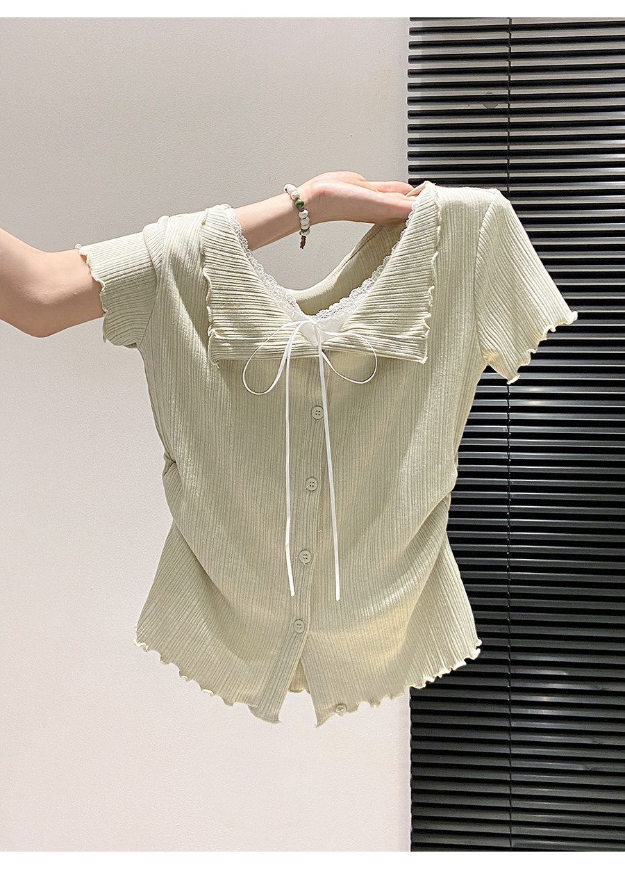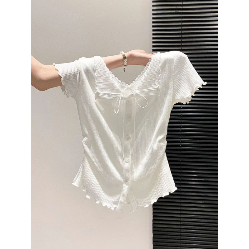 순수한 욕망 바람 레이스 레이스 레이스업 반팔 티셔츠 여성 여름 새로운 페이크 레이어드 몸매 가꾸기 슬림해 보이는 다용도 맨위