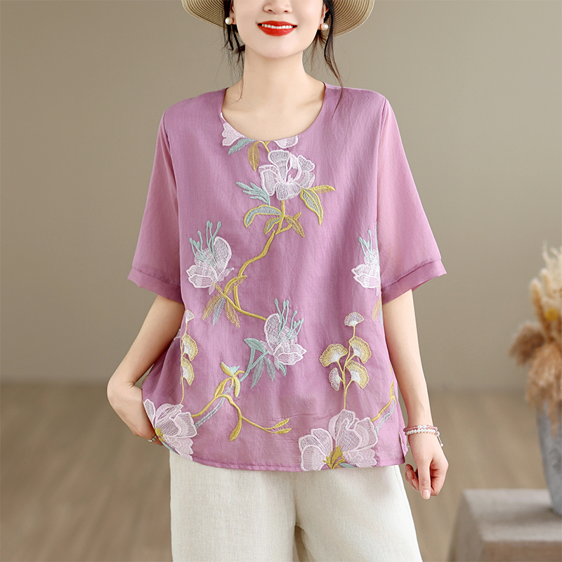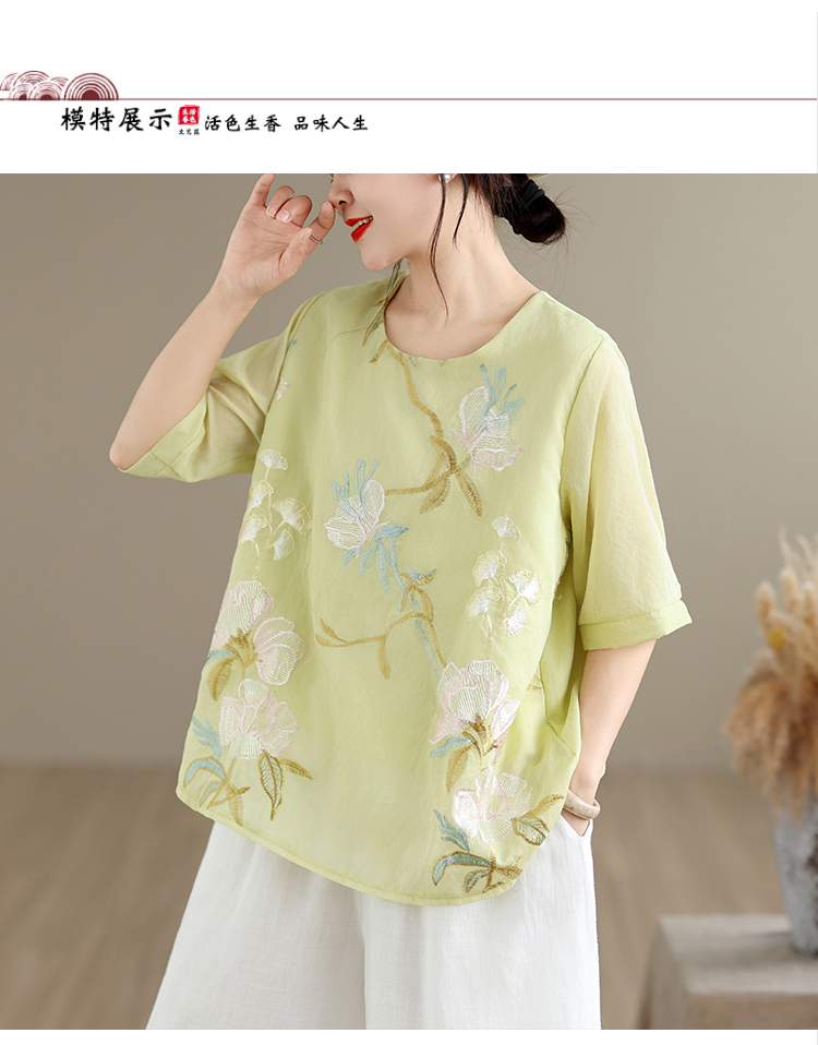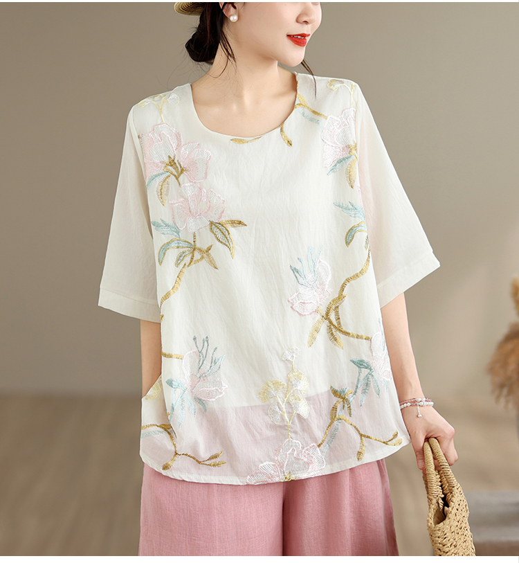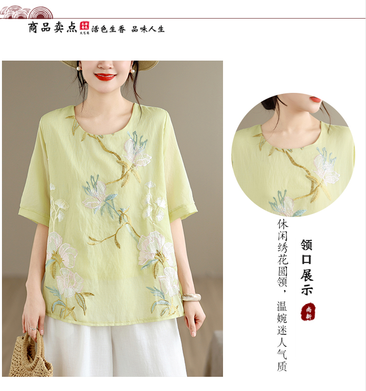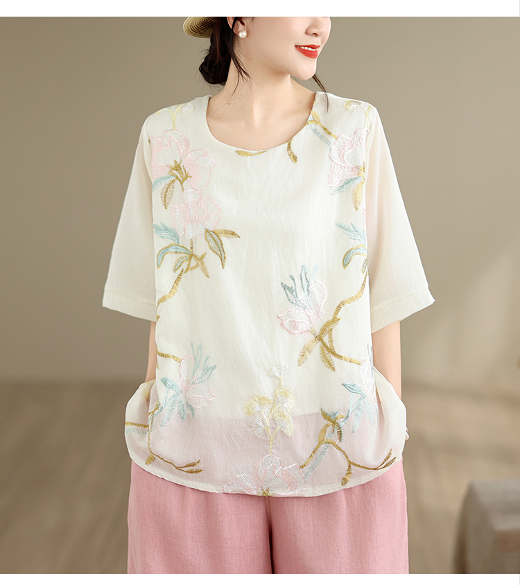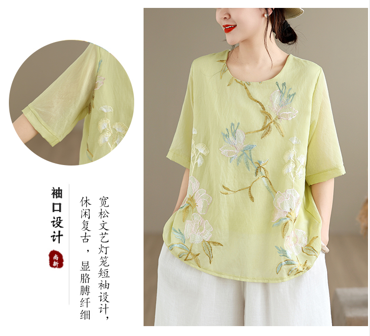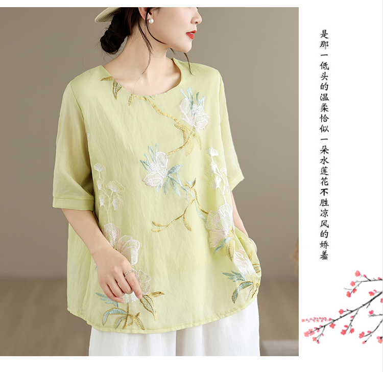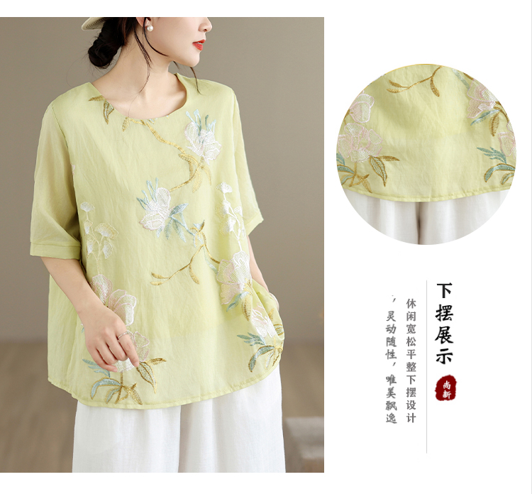 실사 2026 년 여름 새로운 자수 단색 면 린넨 루즈핏 표지 배 슬림해 보이는 맨위 블라우스