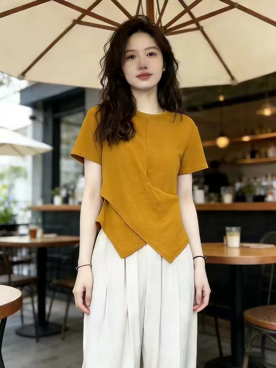 황색 비대칭 디자인 밑단 반팔 티셔츠 여성 2026 여름 새로운 고유 한 아름다운 자이언트 잘 생긴 짧은 맨위
