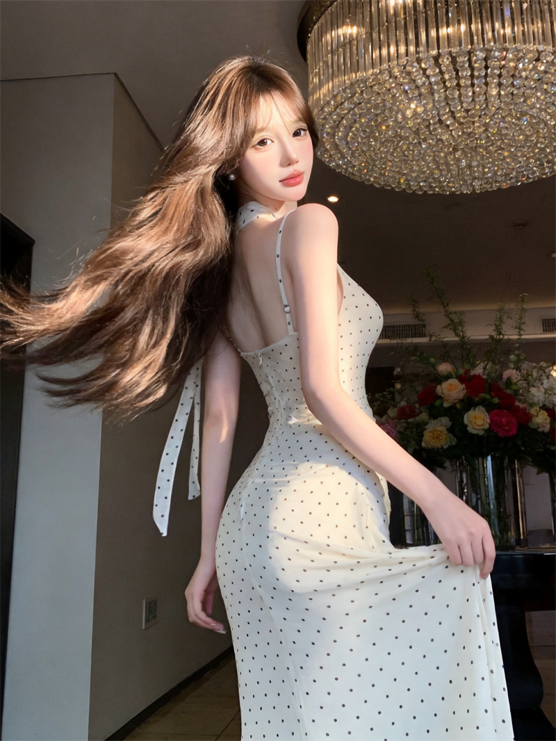 실사 프랑스식 레트로 도트 무늬 디자인 센스 작은 대중 리본 허리 수축 슬림해 보이는 품격 드레스