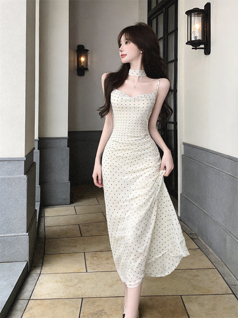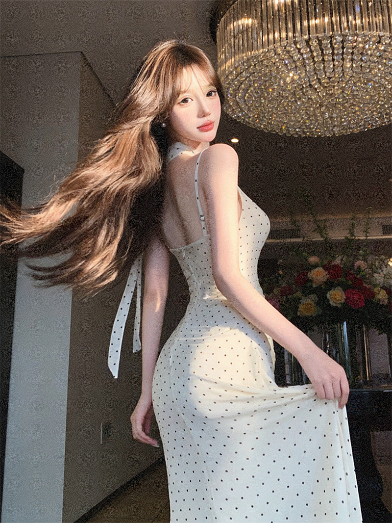 실사 순수한 욕망 작은 키 흔들다 칼라 허리 수축 도트 무늬 슬립 슬림해 보이는 드레스