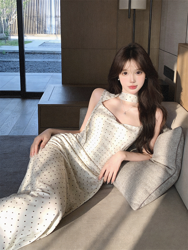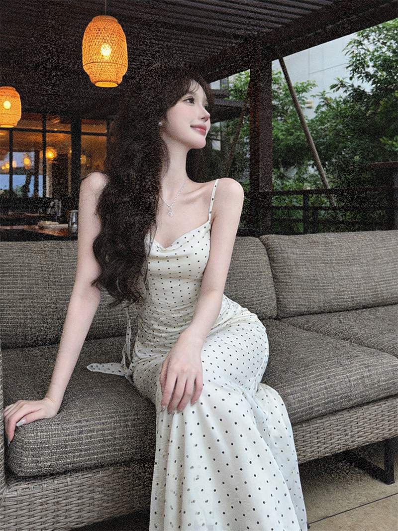 실사 프랑스식 섹시함 새틴 아세트산 슬립 디자인 센스 주름 허리 수축 슬림해 보이는 드레스