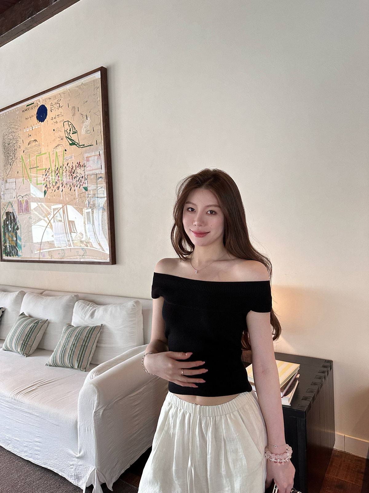 나비 보물 웃음 품격 자매 니트 신축성 4 가지 색상 오프숄더 반팔 맨위 여성 여름 몸매 가꾸기 아름다움 뒤로 티셔츠
