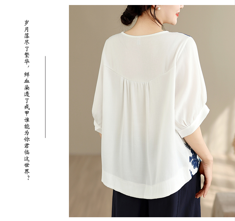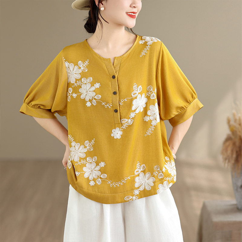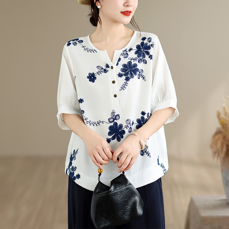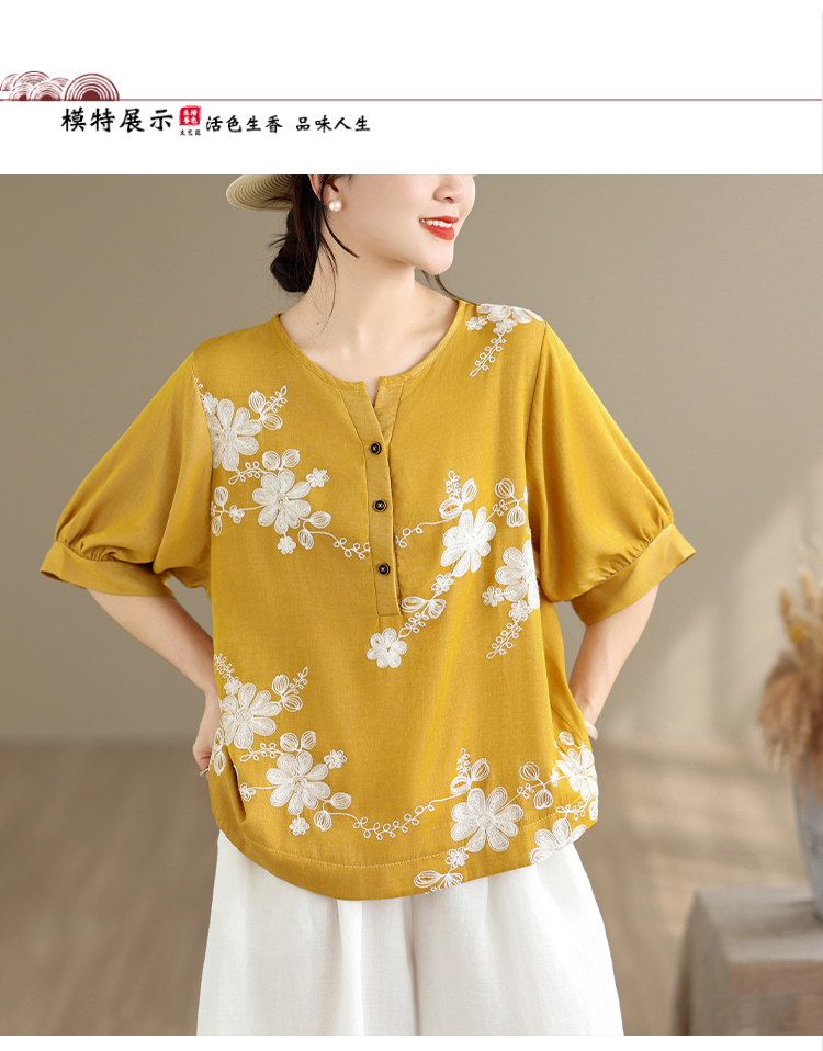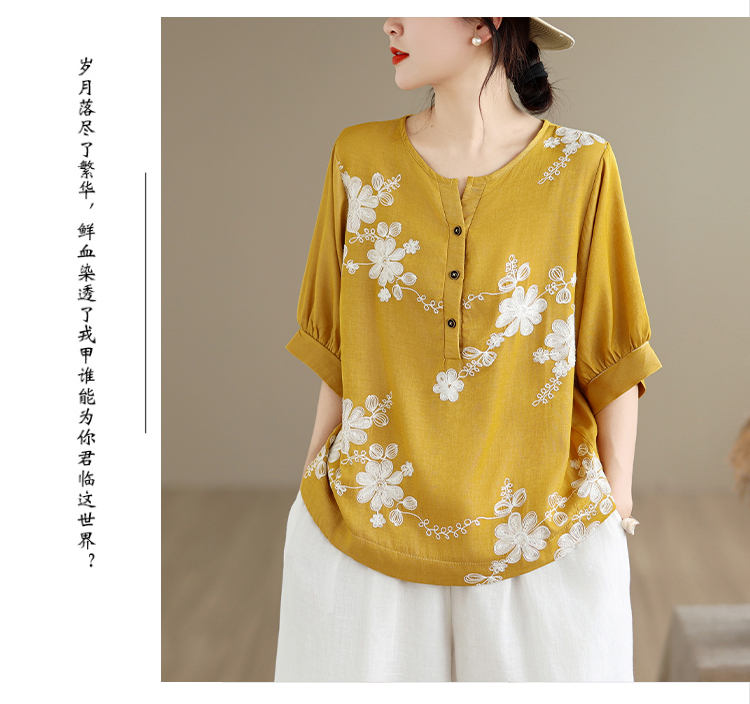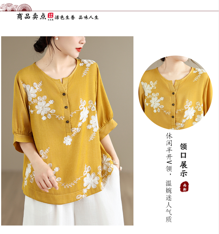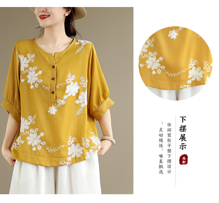 실사 2026 년 여름 새로운 자수 단색 면 린넨 루즈핏 표지 배 슬림해 보이는 맨위 블라우스