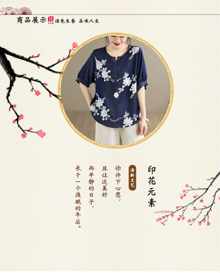 실사 2026 년 여름 새로운 레트로 문예 프린트 면 린넨 패치워크 지방 mm 풀오버 반팔 셔츠