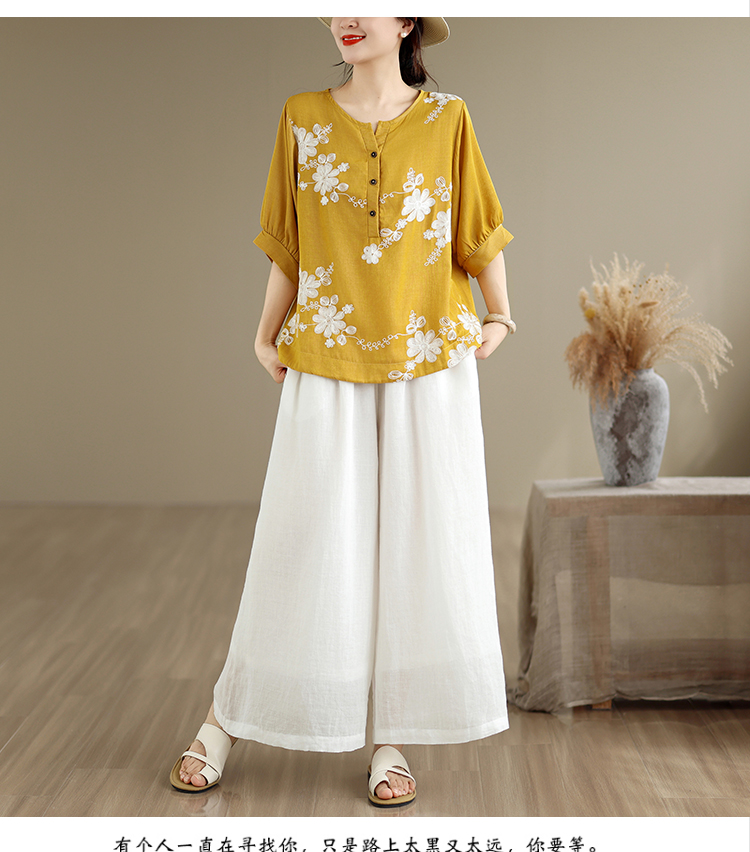 실사 2026 년 여름 새로운 레트로 문예 아마 자수 맨위 넓은 다리 길이 바지 투피스 세트