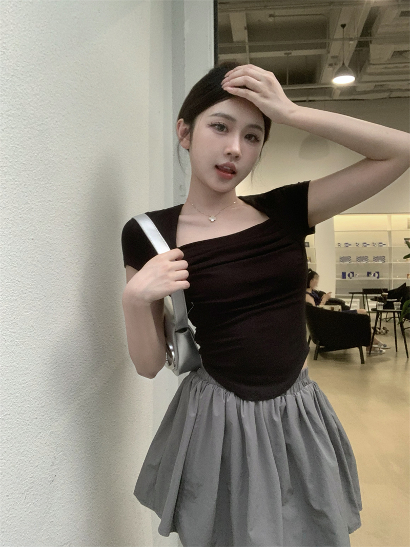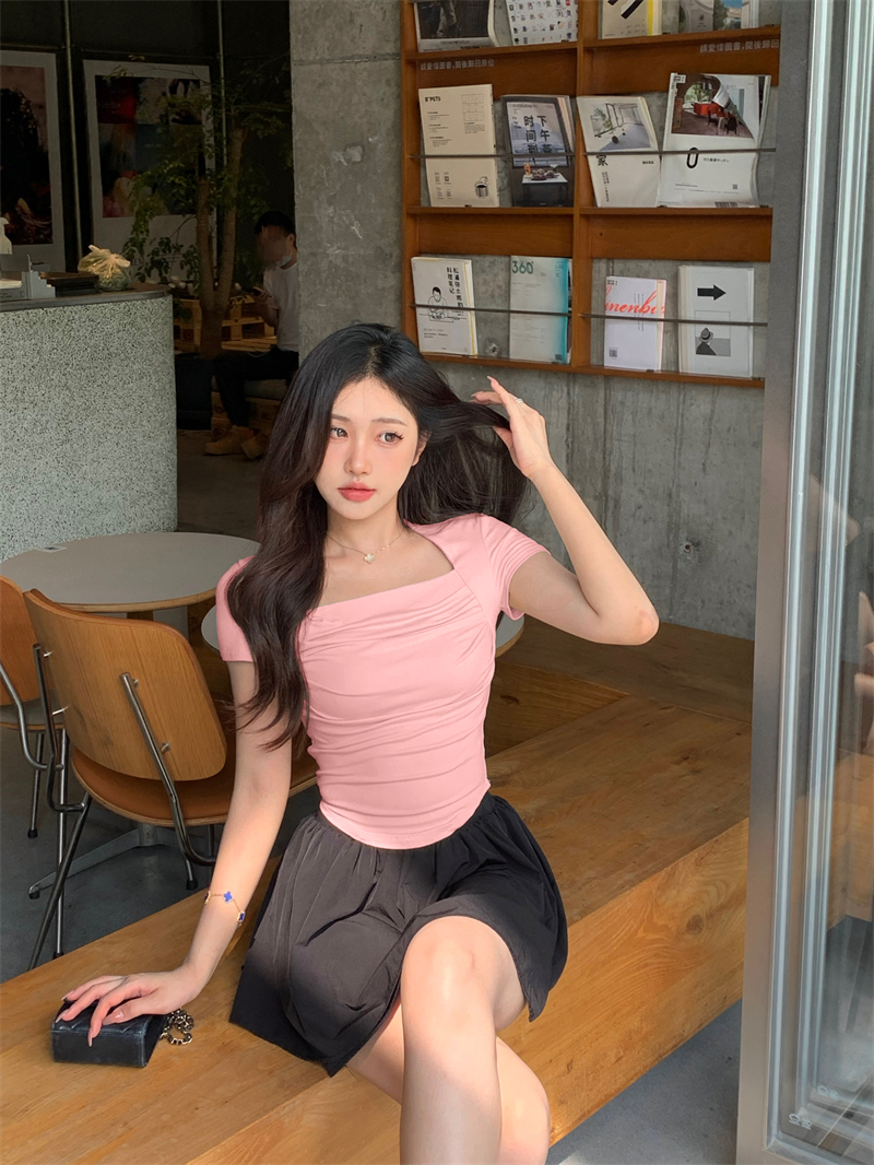 실사 정가 홀로우 아웃 섹시함 이슬 쇄골 반팔 심장 기계 몸매 가꾸기 슬림해 보이는 티셔츠 맨위