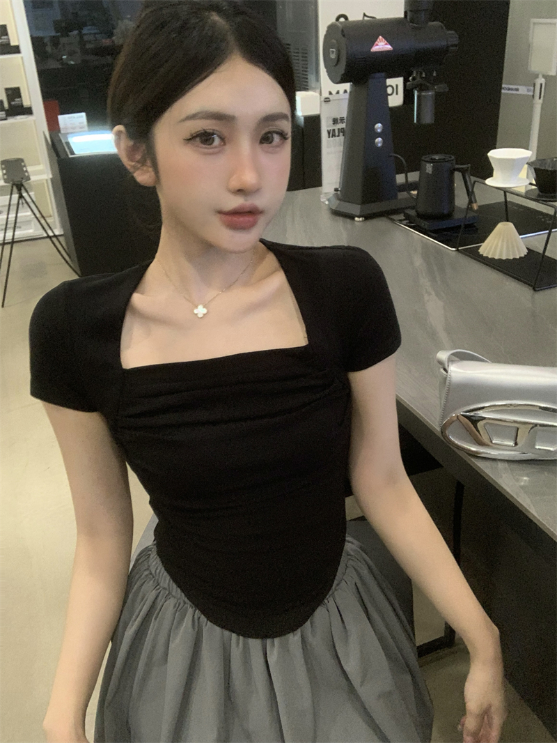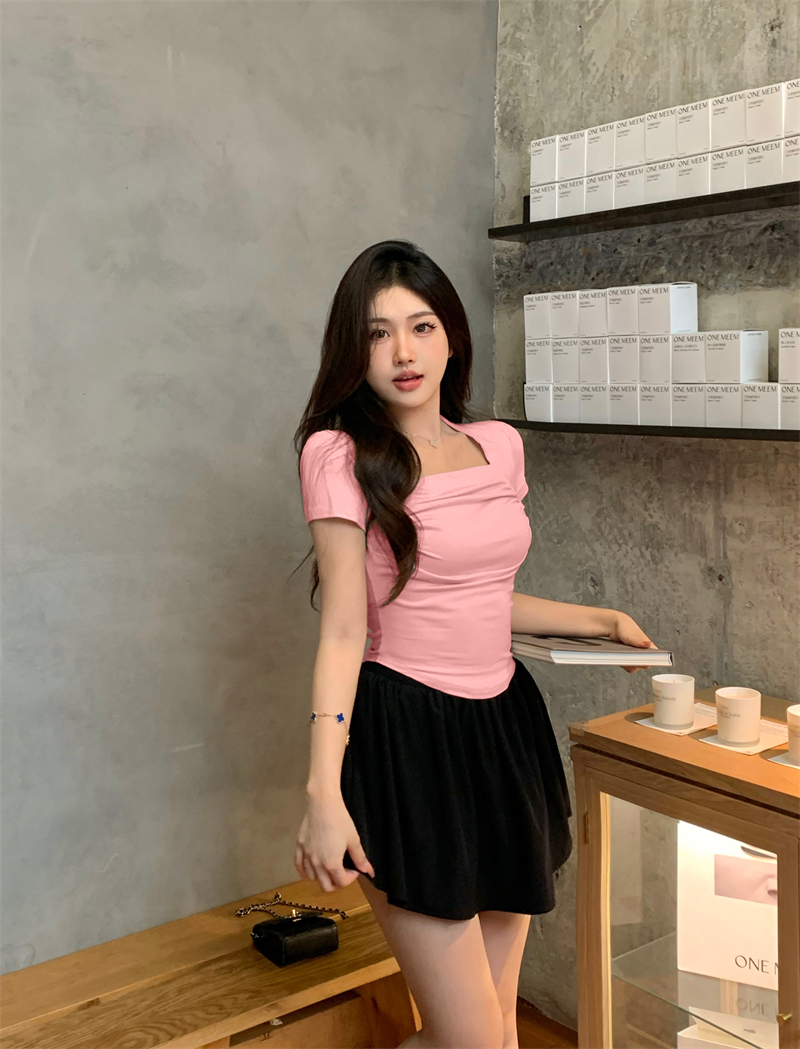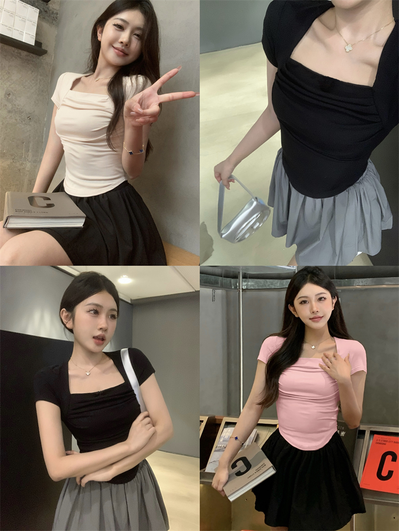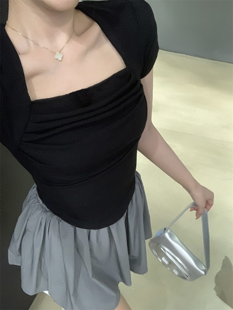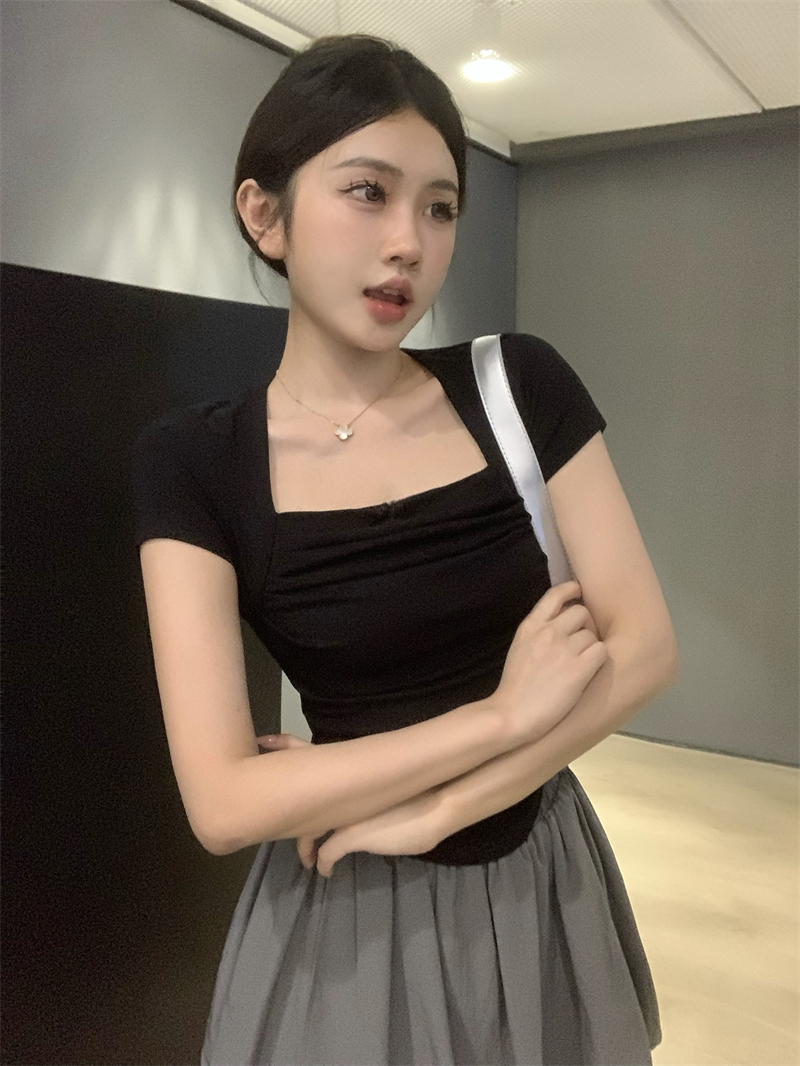 실사 정가 레트로 chic 낮은 가슴 섹시함 광장 칼라 몸매 가꾸기 슬림해 보이는 단색 긴팔 티셔츠 맨위