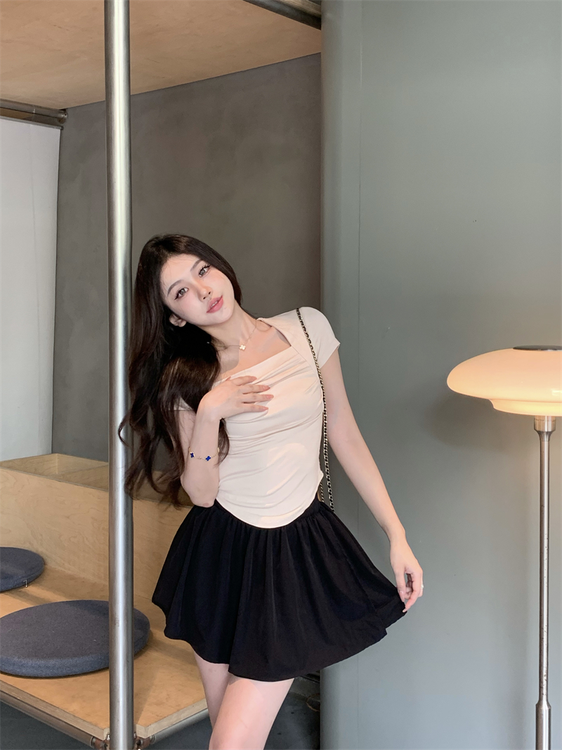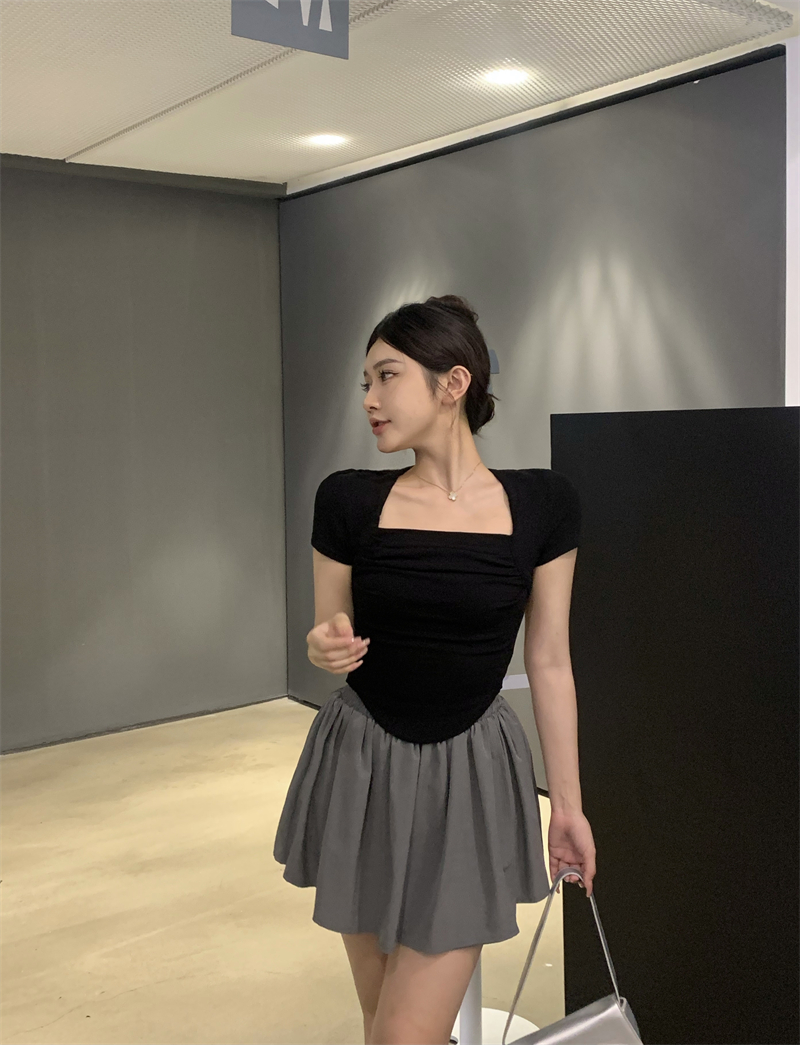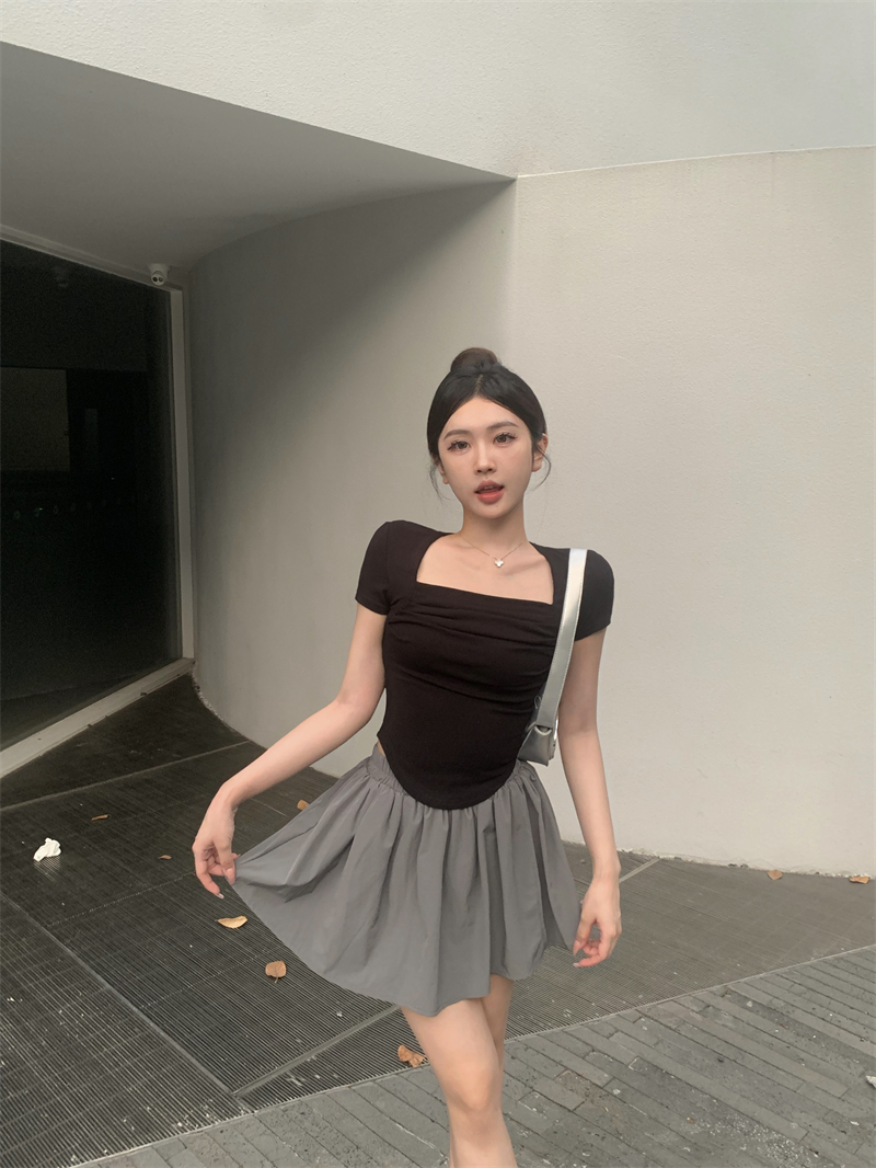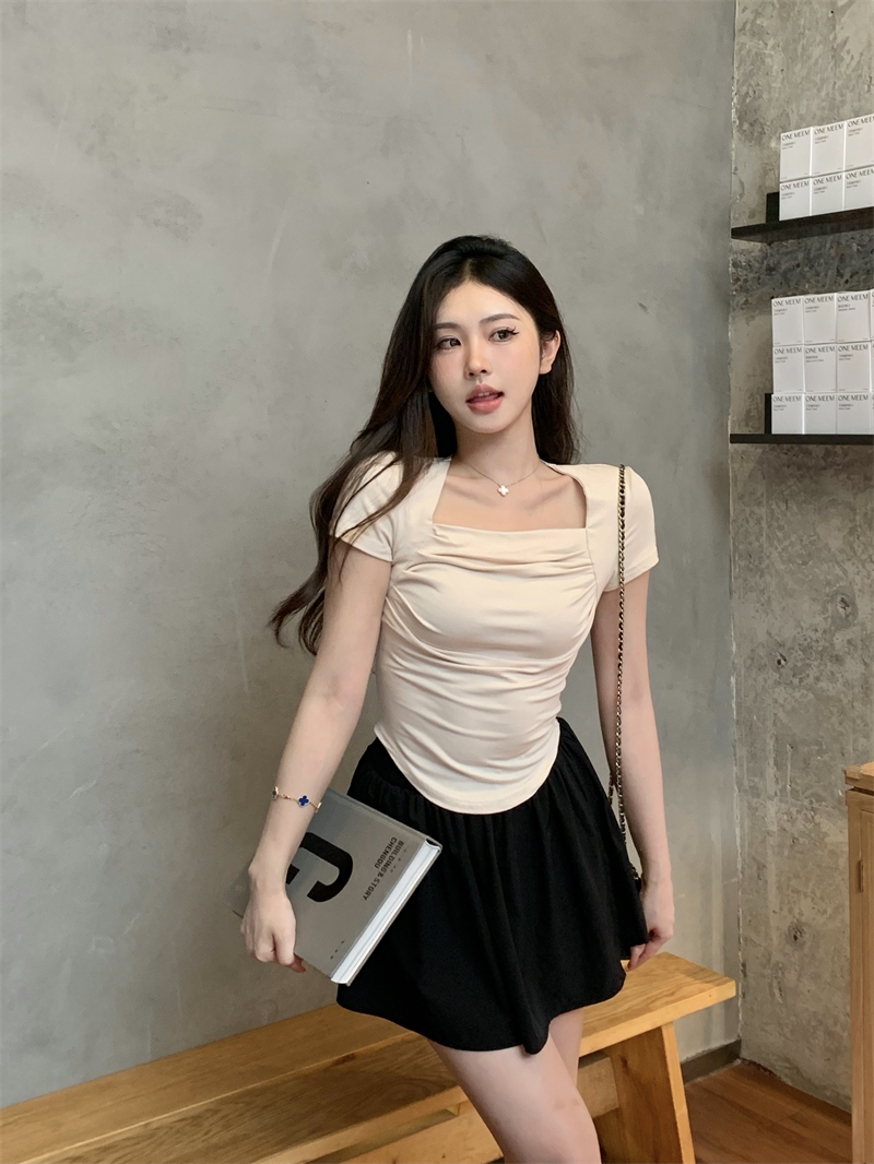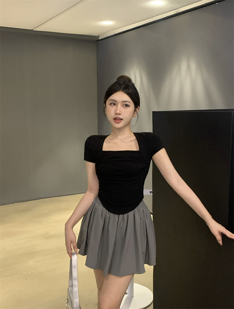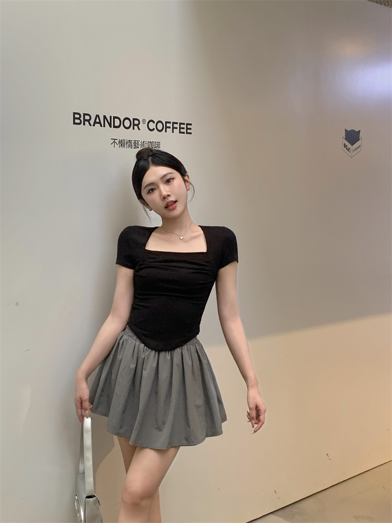 실사 정가 레트로 chic 낮은 가슴 섹시함 광장 칼라 몸매 가꾸기 슬림해 보이는 단색 긴팔 티셔츠 맨위