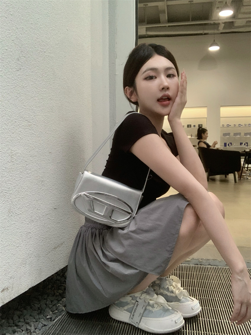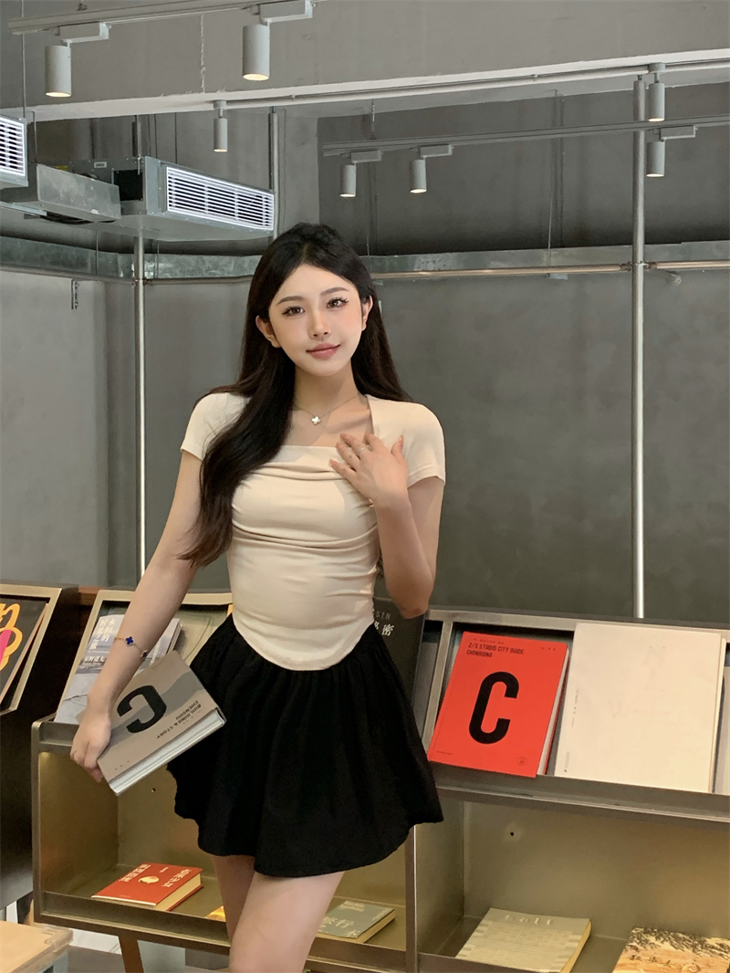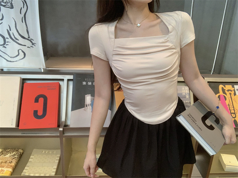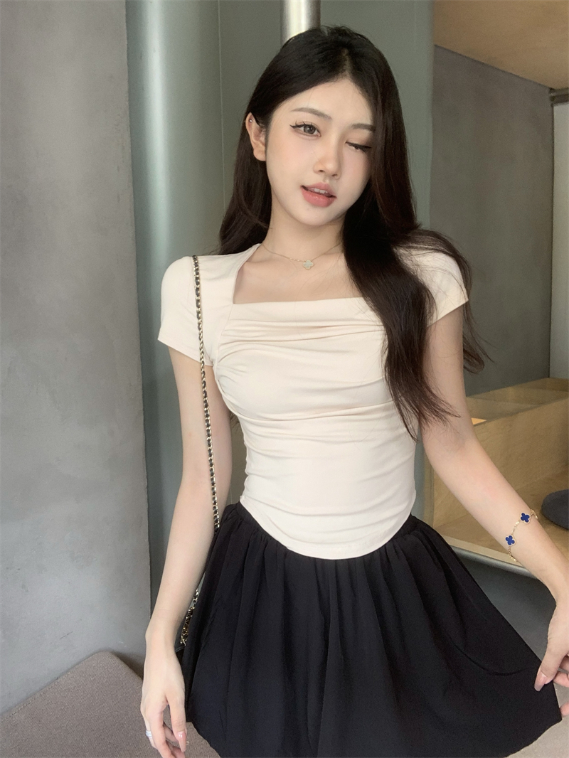 실사 정가 레트로 라운드 넥 쇼트 스타일 몸매 가꾸기 티셔츠 여성 만나는 하이웨이스트 반팔 맨위
