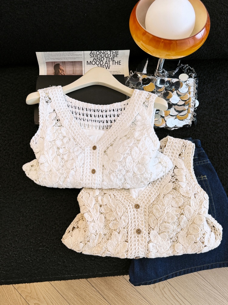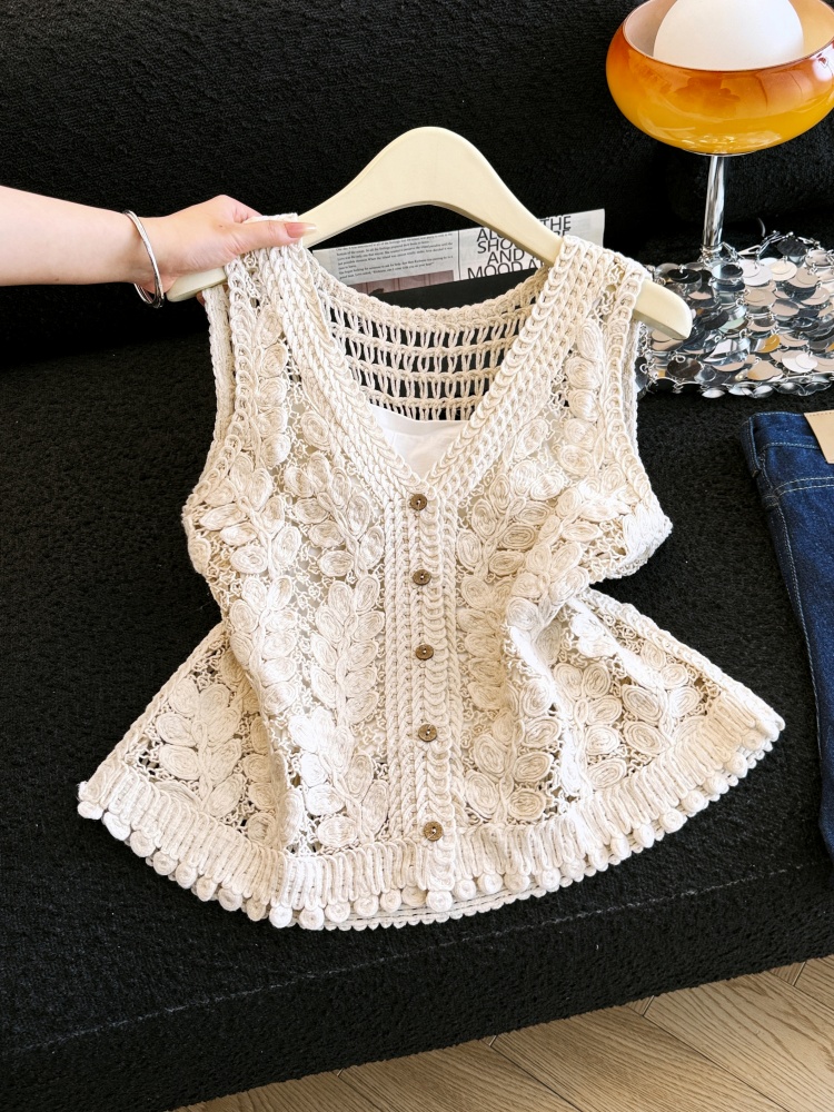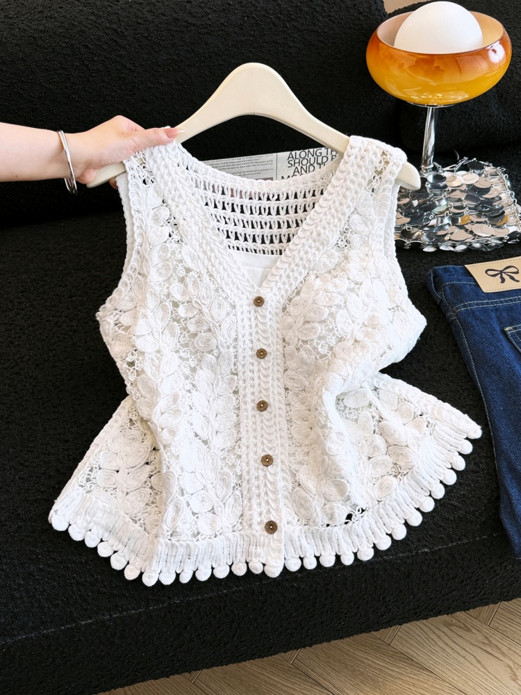 실사 프랑스식 홀로우 아웃 자수 술 V넥 니트 베스트 조끼 여성 여름 외국 가스 스택 착용 맨위