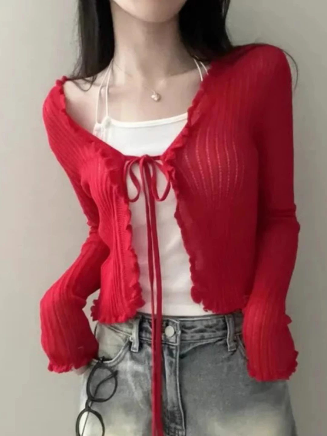 자수 홀로우 아웃 니트 오픈 가디건 여성 2026 여름 새로운 쇼트 스타일 레이스업 긴팔 자외선 차단 블라우스 다용도 맨위