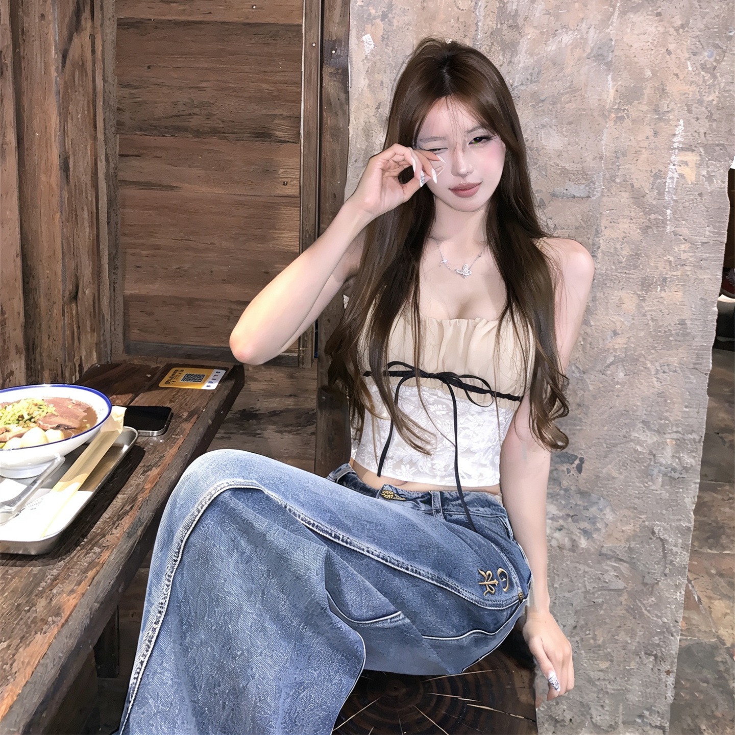 실사 정가 낭만적 인 기질 자카드 레이스업 튜브탑 맨위