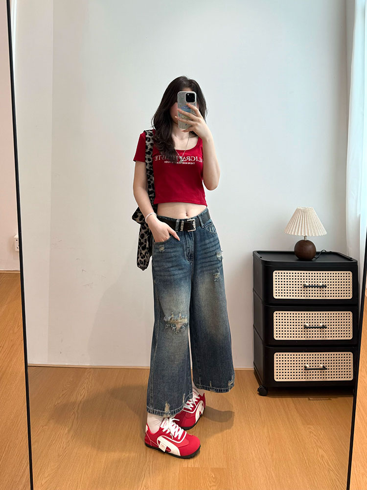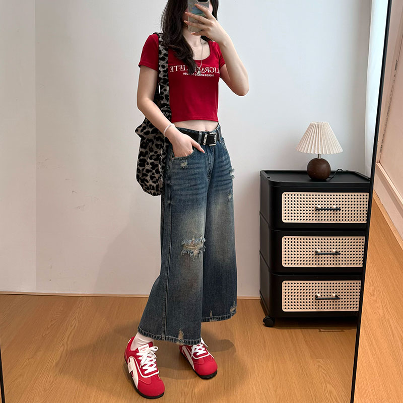 2026 여름 새로운 패션 슬림해 보이는 몸매 가꾸기 레트로 찢어진 부분 슬림해 보이는 캐주얼 넓은 다리 8 점 스트레이트 청바지