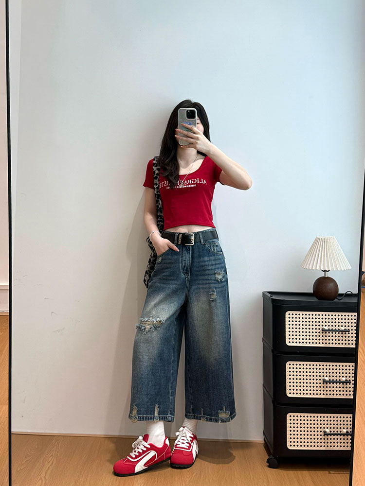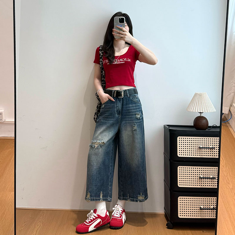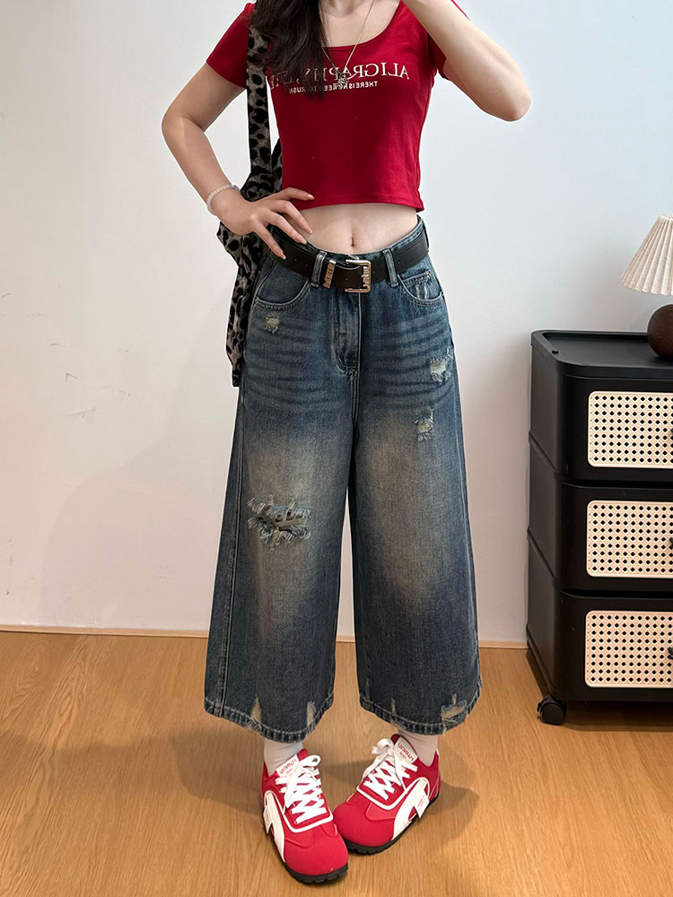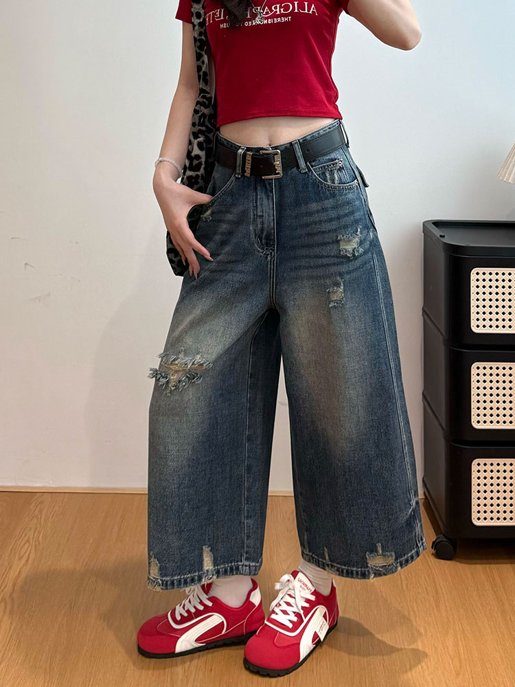 Annan 여름 새로운 개성 루즈핏 슬림해 보이는 와이드 레깅스 바지 작은 키 하이웨이스트 8 점 찢어진 부분 청바지