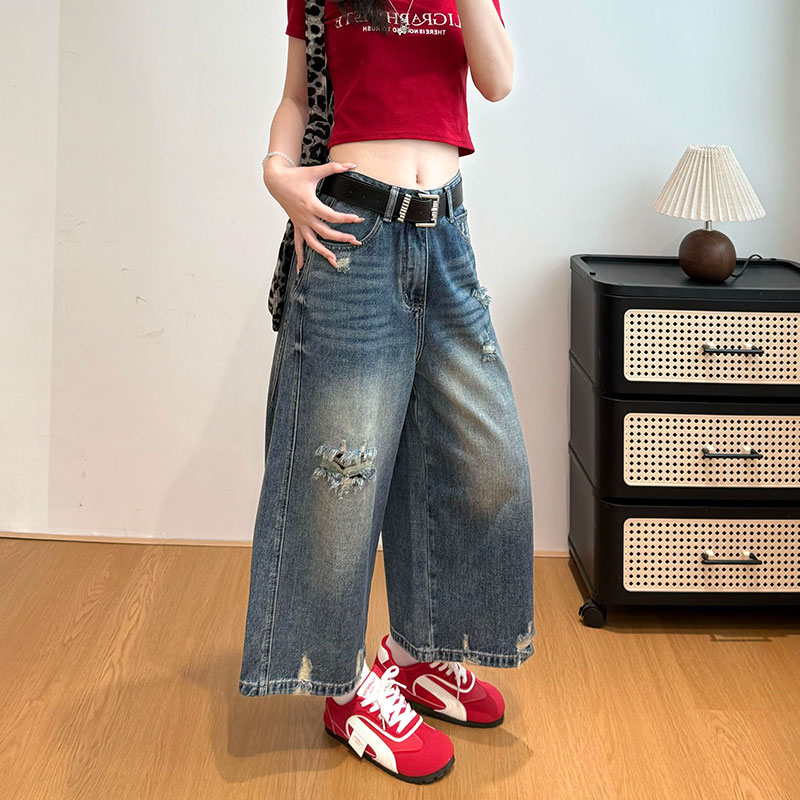 트렌디 공주 66085 찢어진 부분 7 점 와이드 레그 팬츠 2026 여름 새로운 패션 트렌디 다용도 루즈핏 슬림해 보이는 청바지