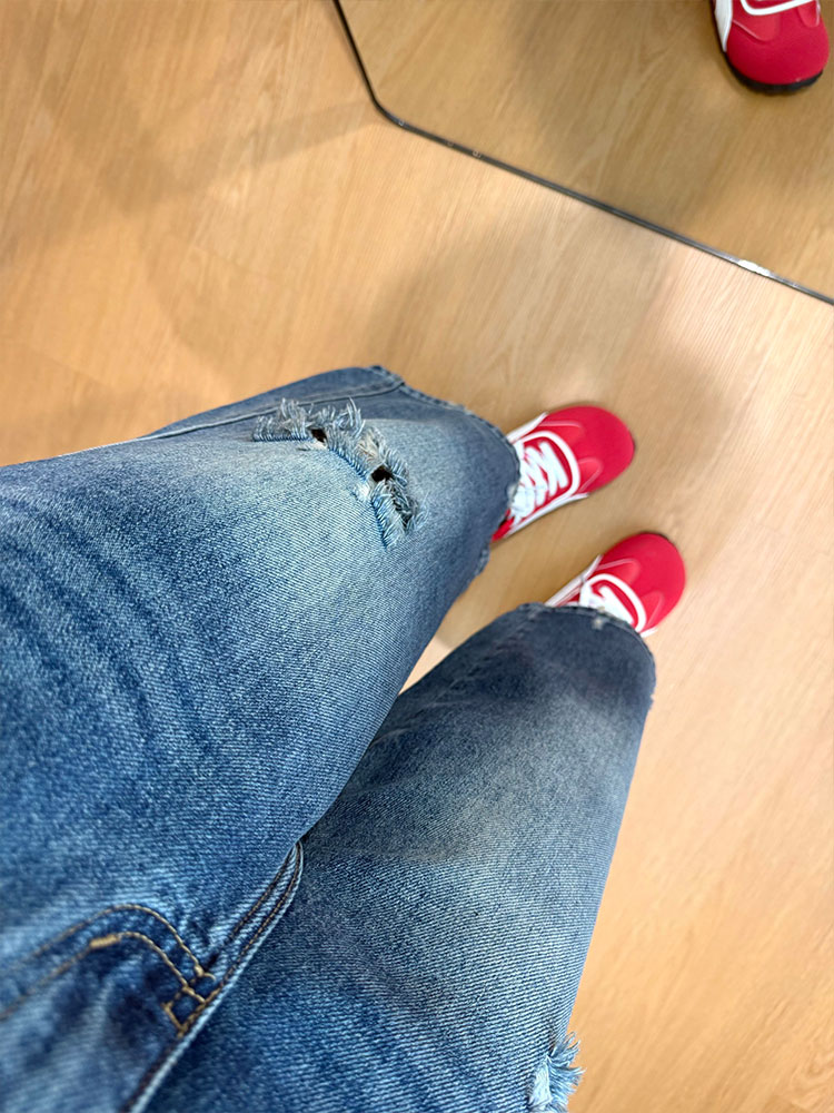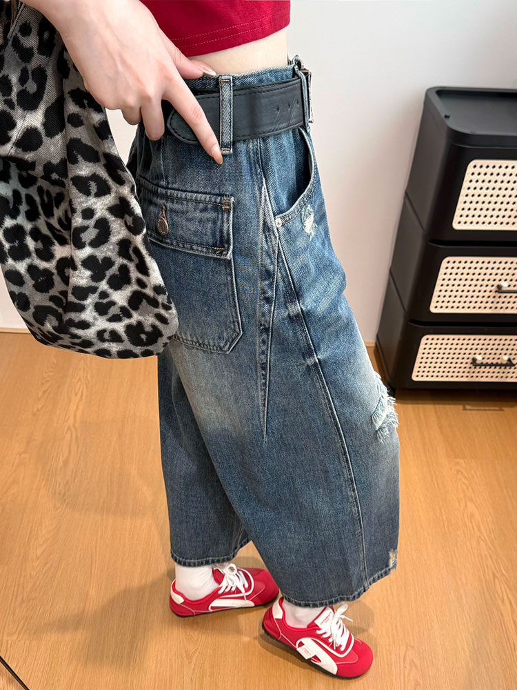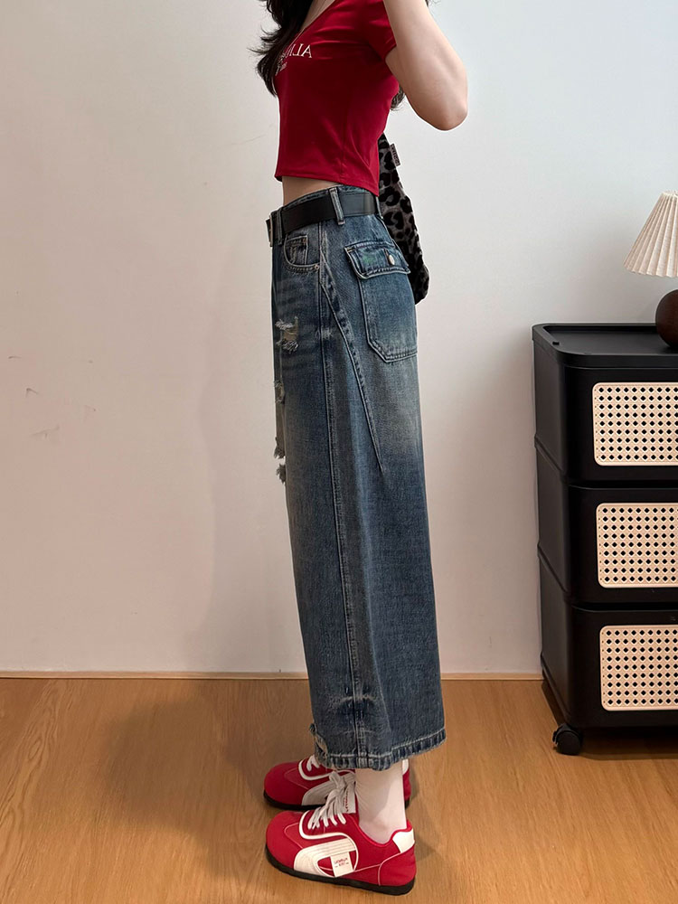 素心 블루 youmo 2026 여름 드레스 레트로 마 오래된 착용 찢어진 부분 캐주얼 8 점 와이드 레그 팬츠 청바지 여성