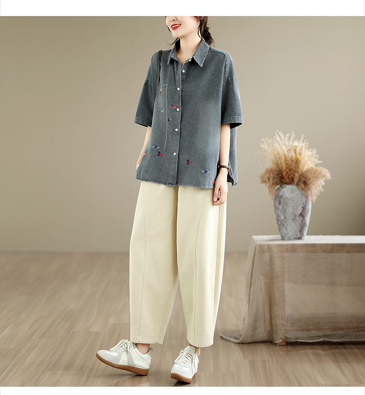 실사 2026 년 여름 새로운 자수 단색 면 린넨 루즈핏 표지 배 슬림해 보이는 맨위 블라우스