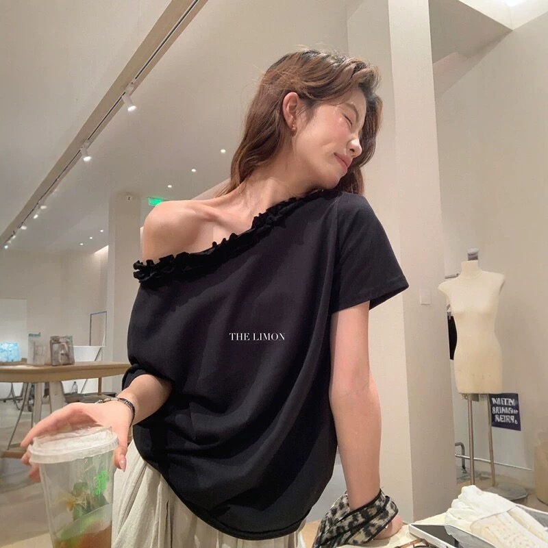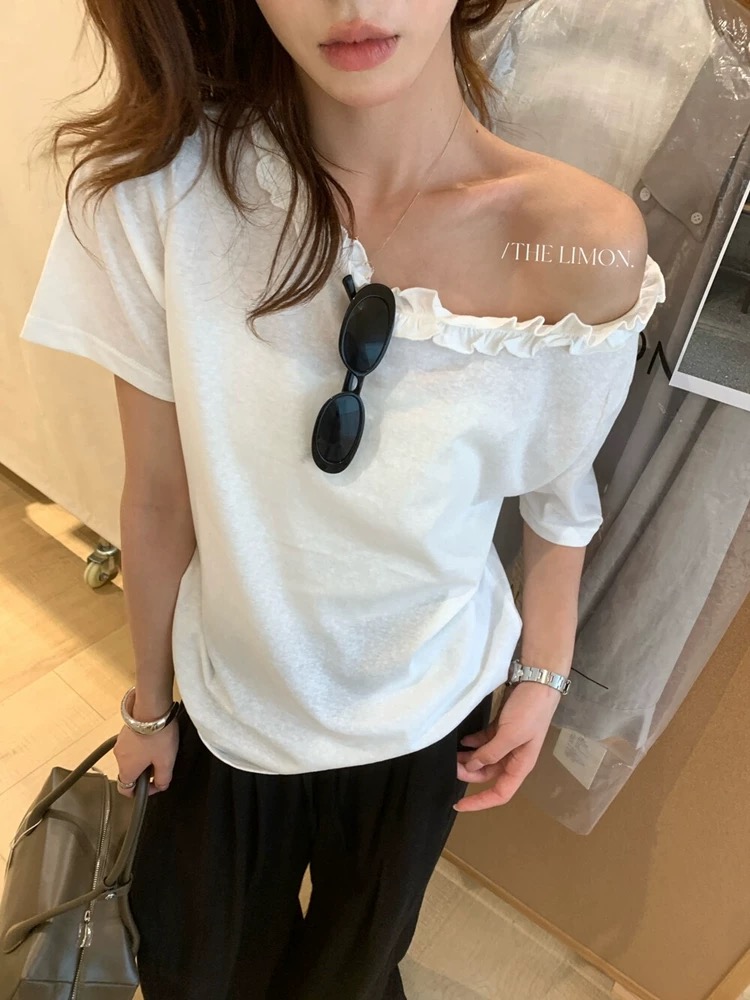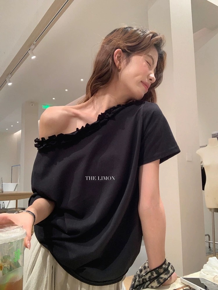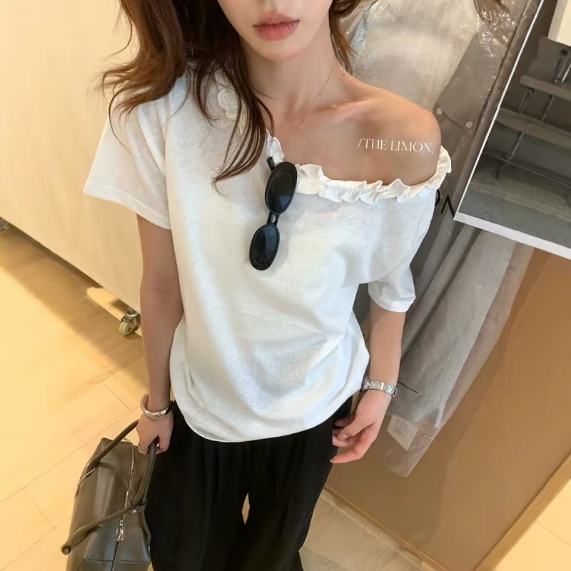 한 부서 프릴 비스듬한 칼라 오프숄더 반팔 티셔츠 여성 여름 새로운 디자인 센스 루즈핏 슬림해 보이는 오프숄더 맨위