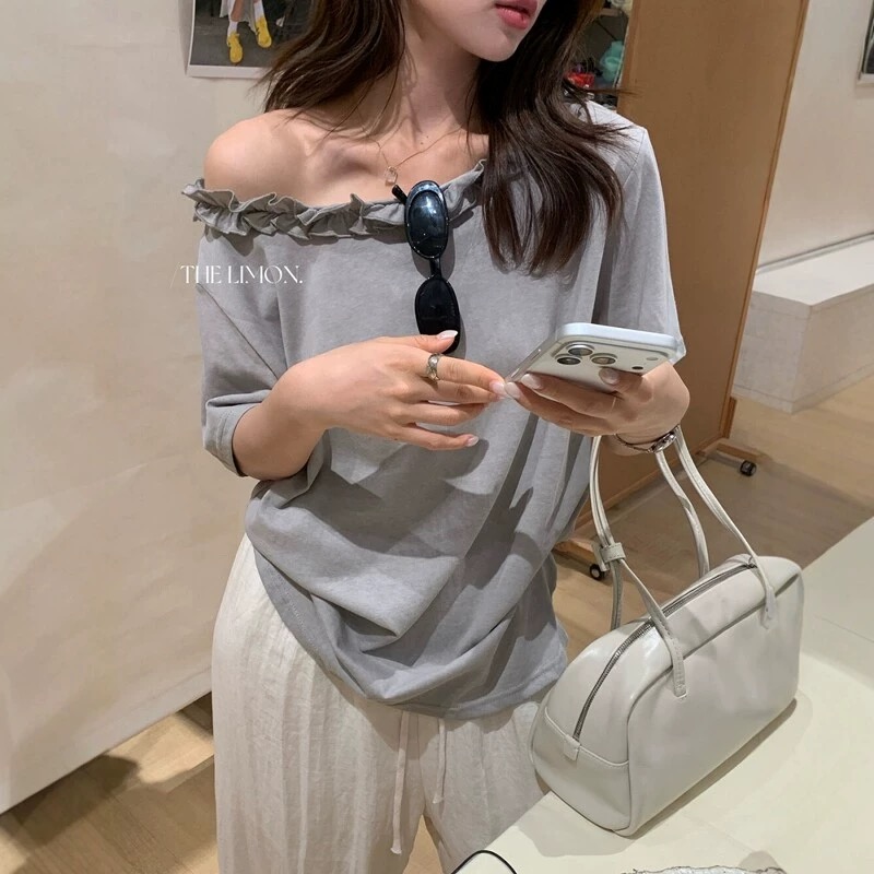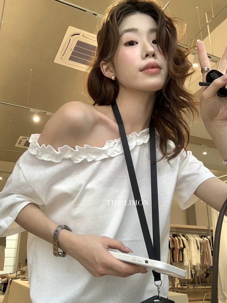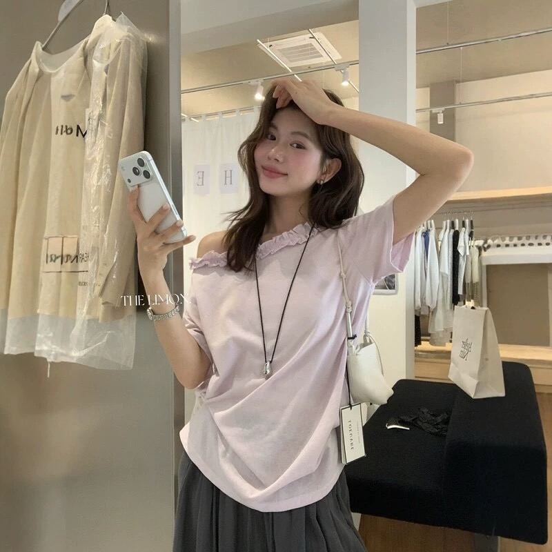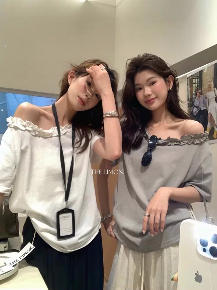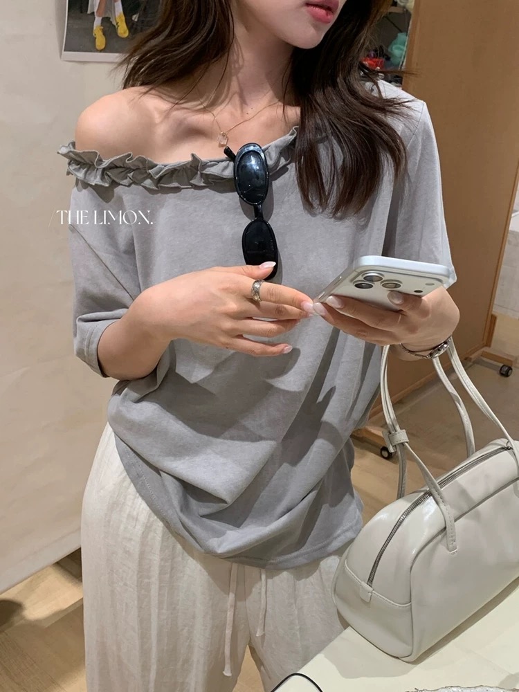 한 부서 프릴 비스듬한 칼라 오프숄더 반팔 티셔츠 여성 여름 새로운 디자인 센스 루즈핏 슬림해 보이는 오프숄더 맨위
