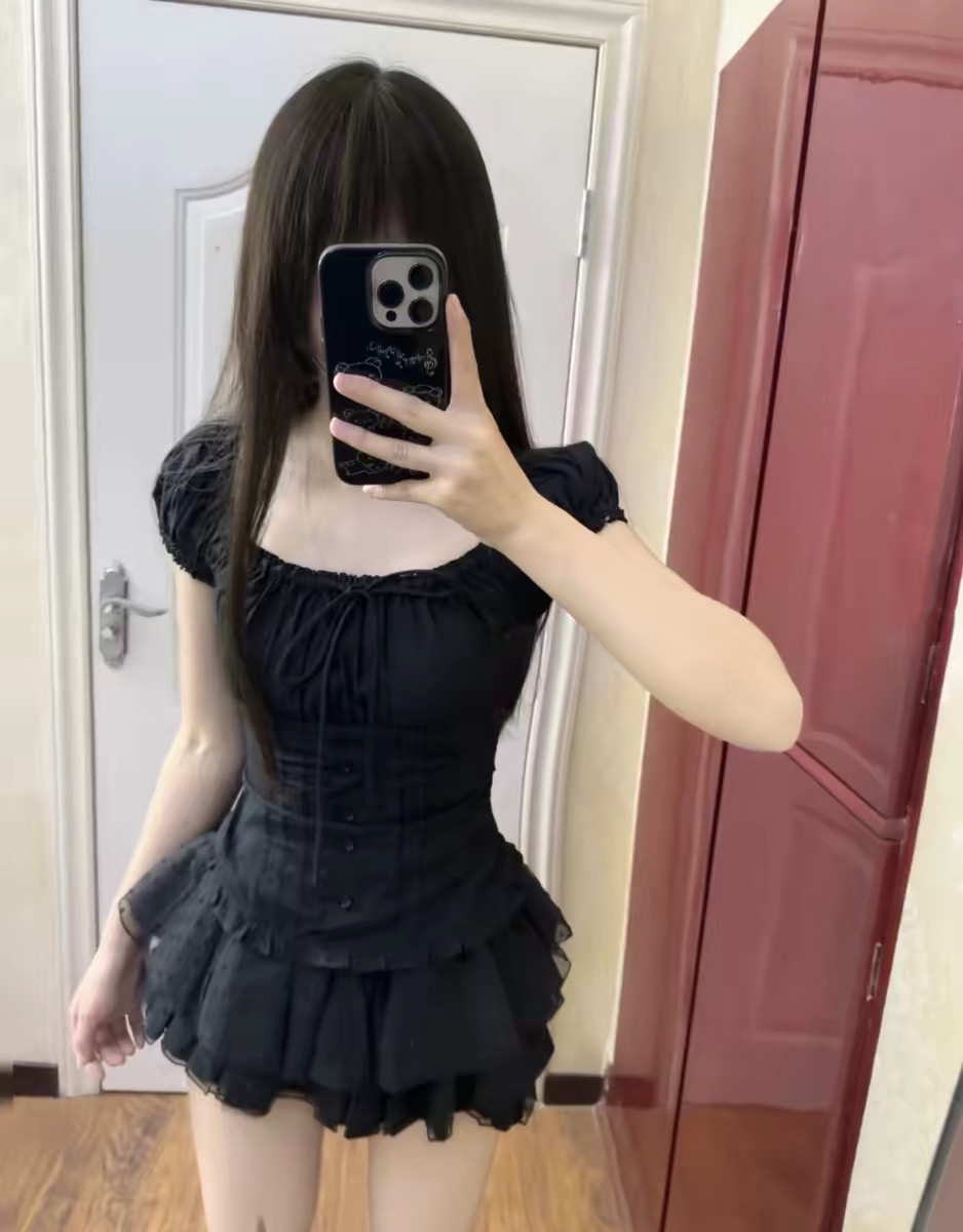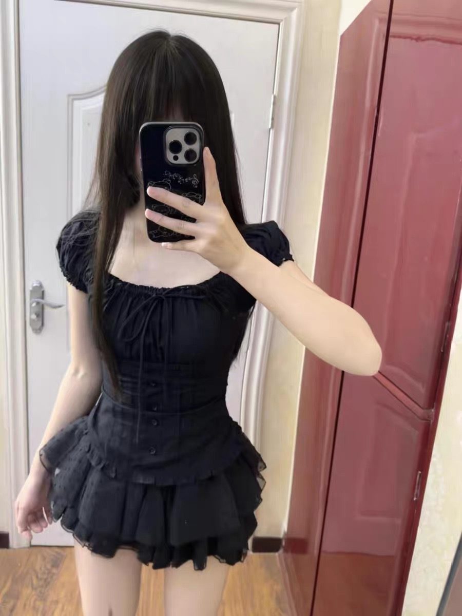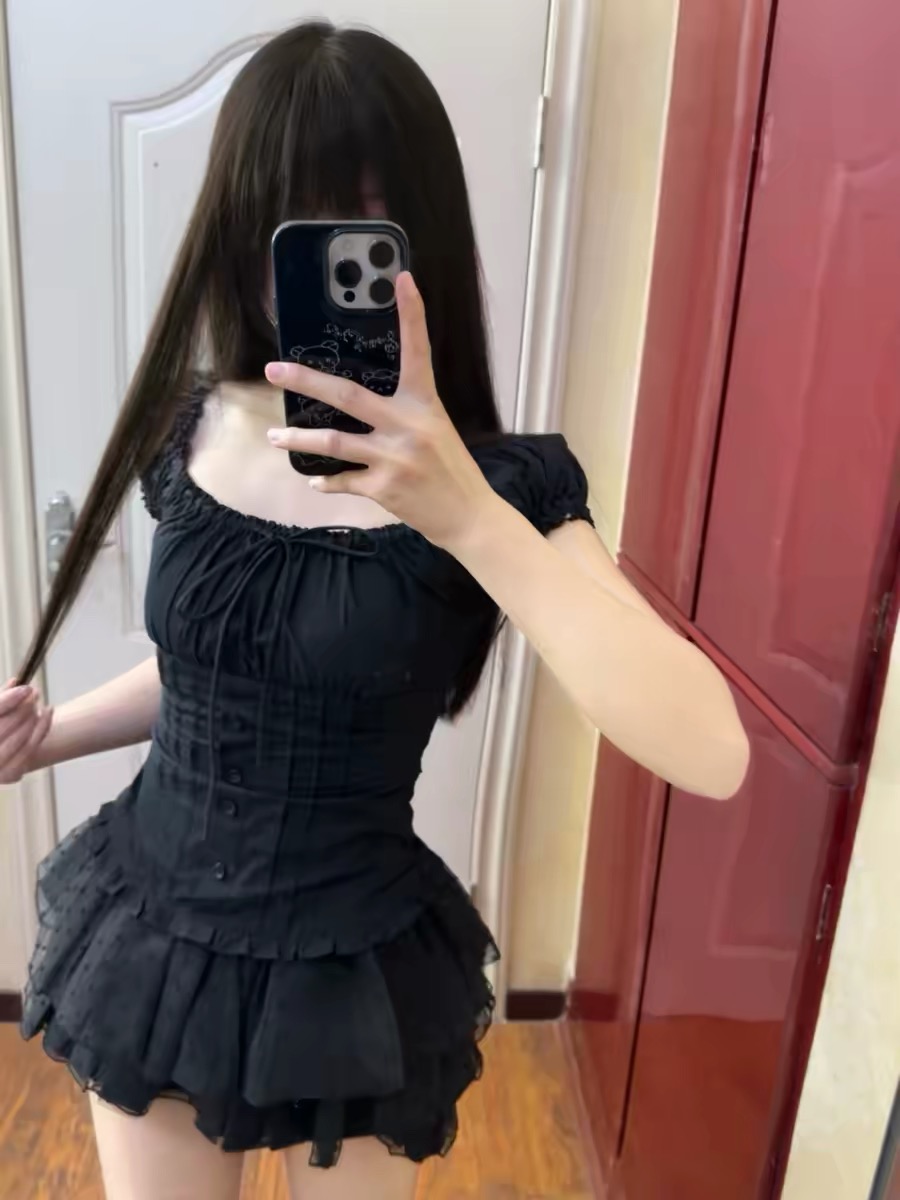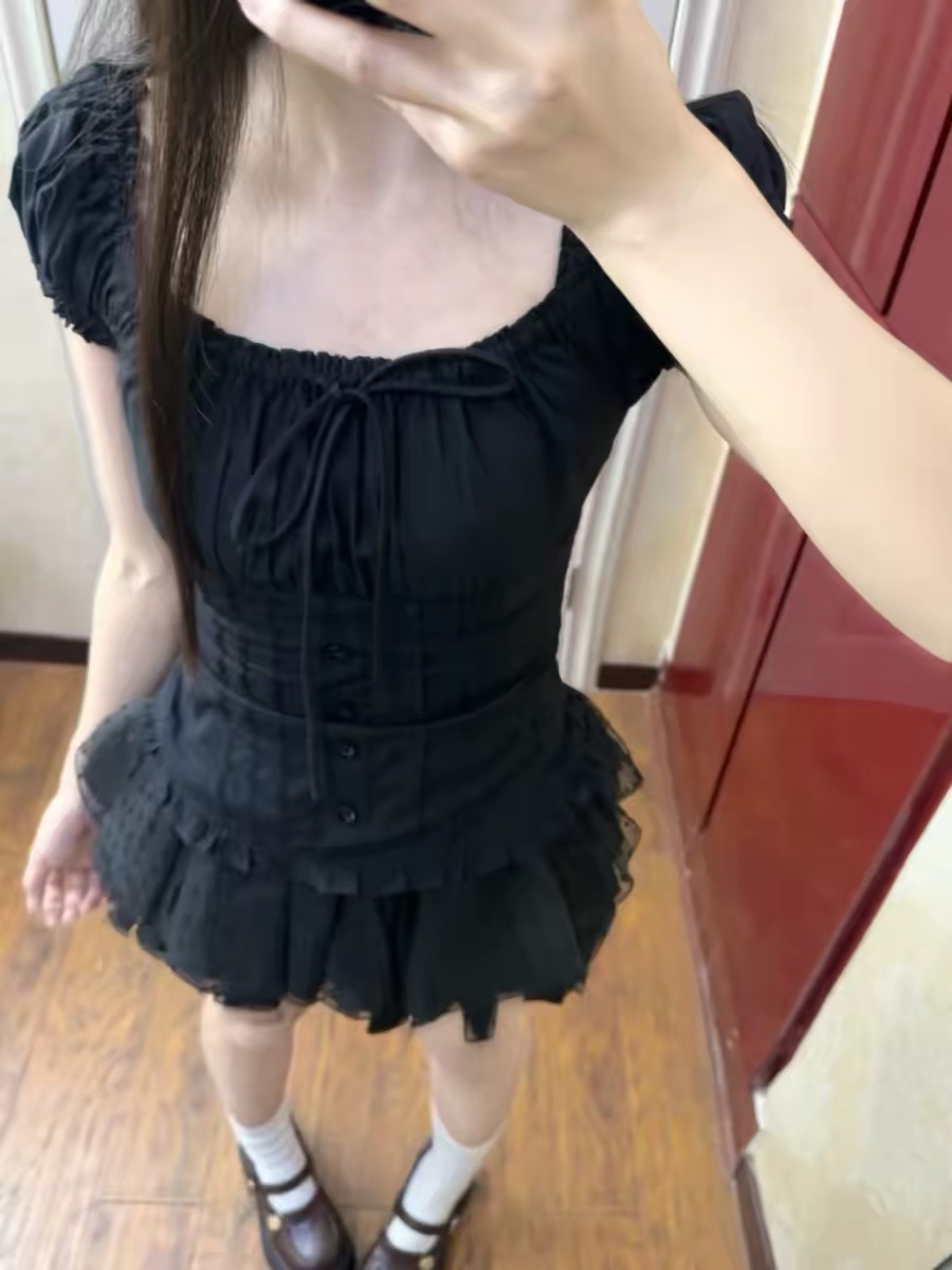 프랑스식 검정색 고급 센스 거품 소매 광장 칼라 셔츠 반팔 도트 무늬 레이스 퍼프 케이크 반신 스커트 투피스 세트
