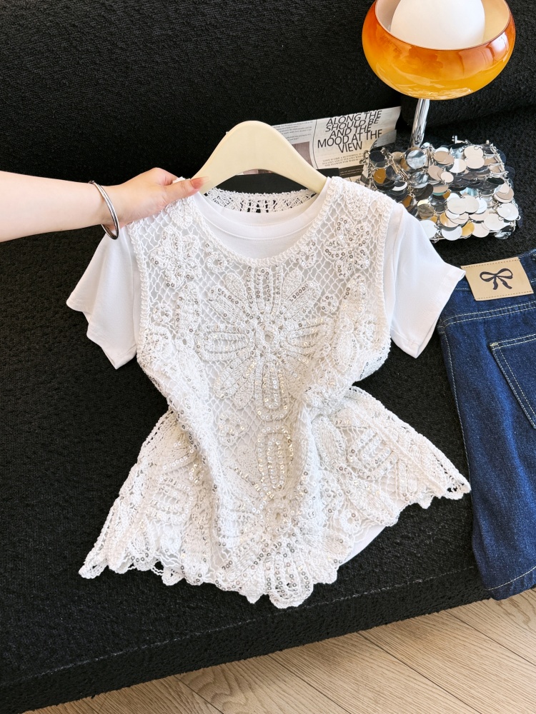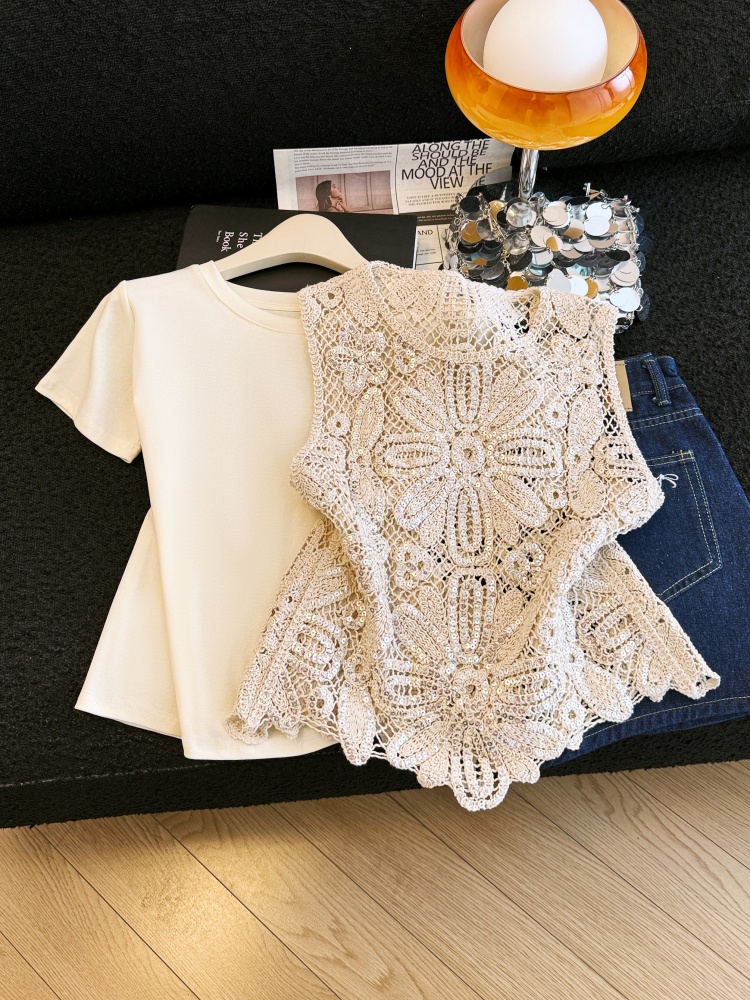 실사 여름 새로운 자수 홀로우 아웃 무거운 작업 구슬 조각 자수 레이스 베스트 다용도 반팔 티셔츠 투피스 슈트