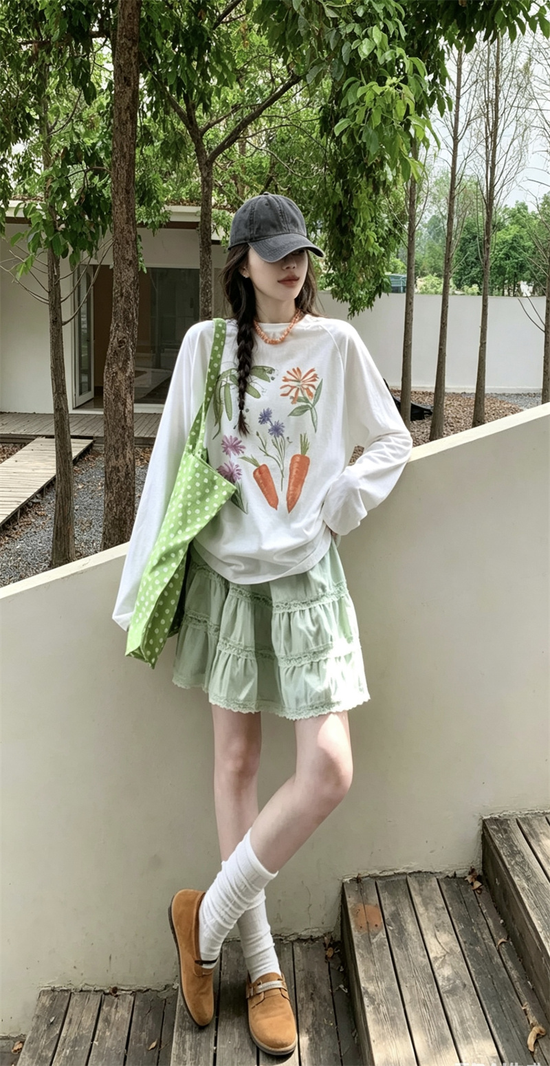 실사 정가 느긋한 달콤함 과일 푸성귀 프린트 얇은 스타일 자외선 차단 긴팔 맨위 한 마디 케이크 드레스 투피스 슈트