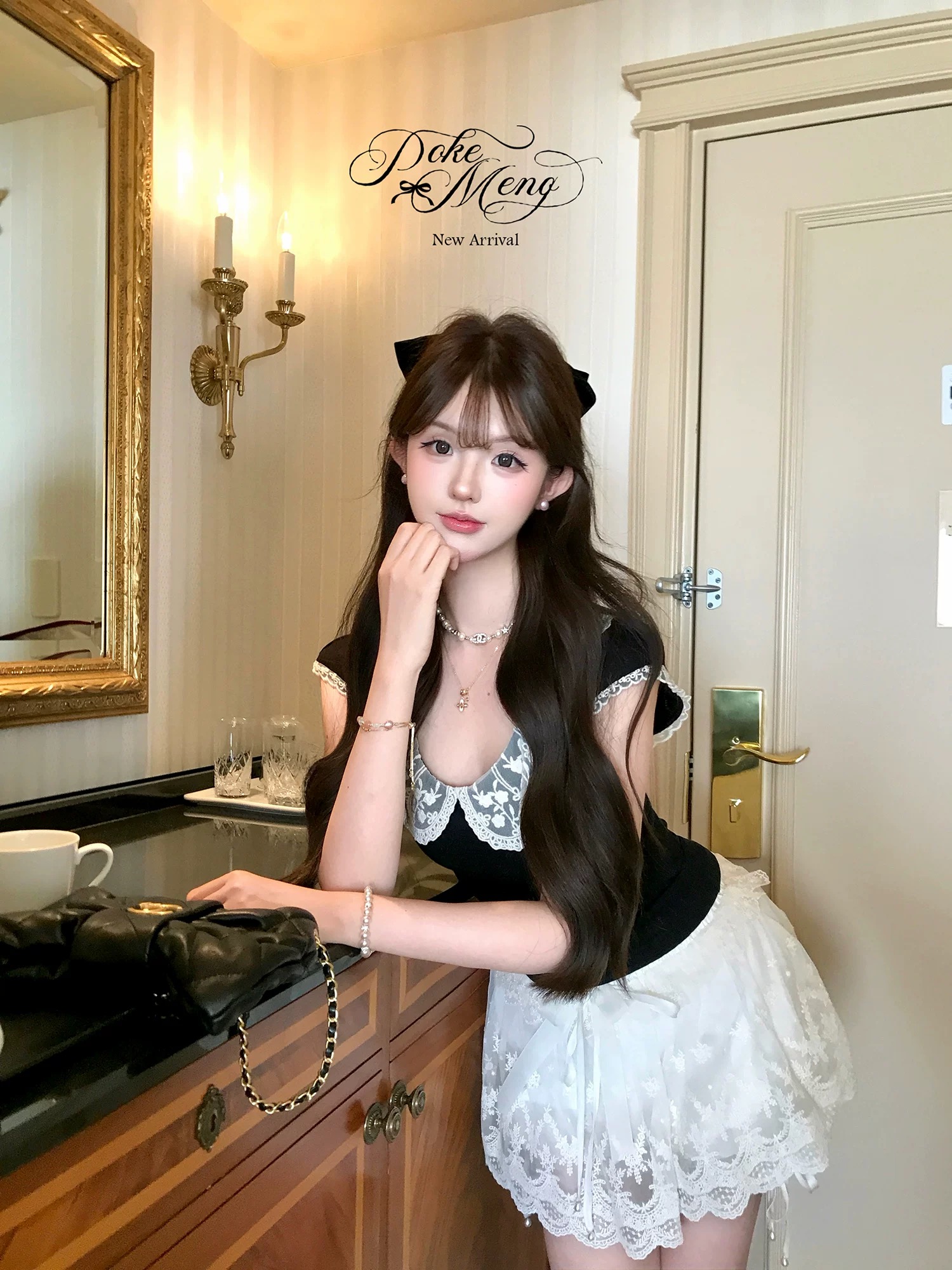 heygirl 블랙 형제 엷 은 안개 마이크로 프랑스식 무거운 작업 Tulle 질감 센스 패치워크 레이스 레이스 스트랩 맨위