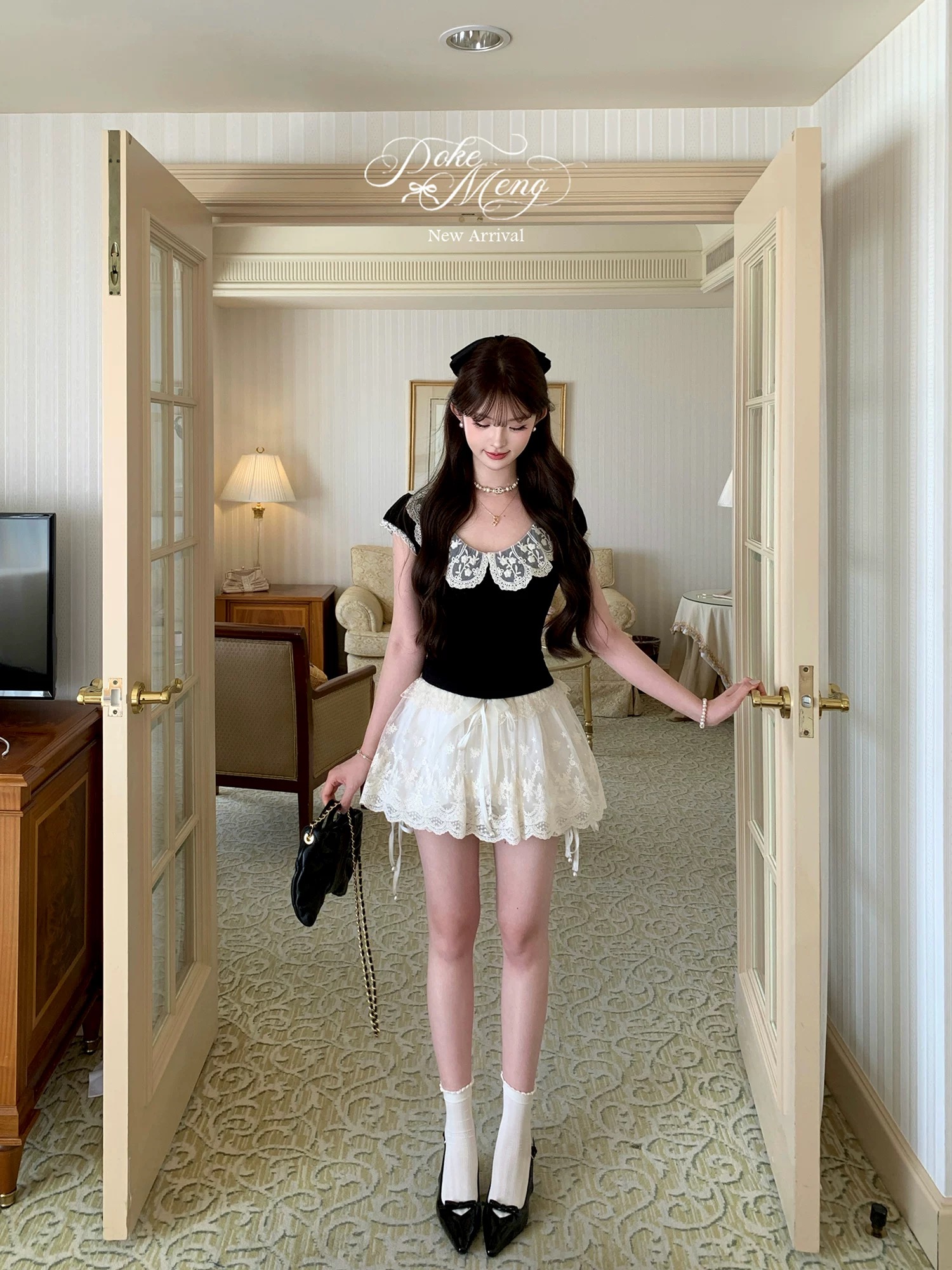 westayone2026 이른 봄 검정색 그리드 패치워크 레이스 셔츠 화이트 홀로우 아웃 케이크 롱 스커트 투피스 세트