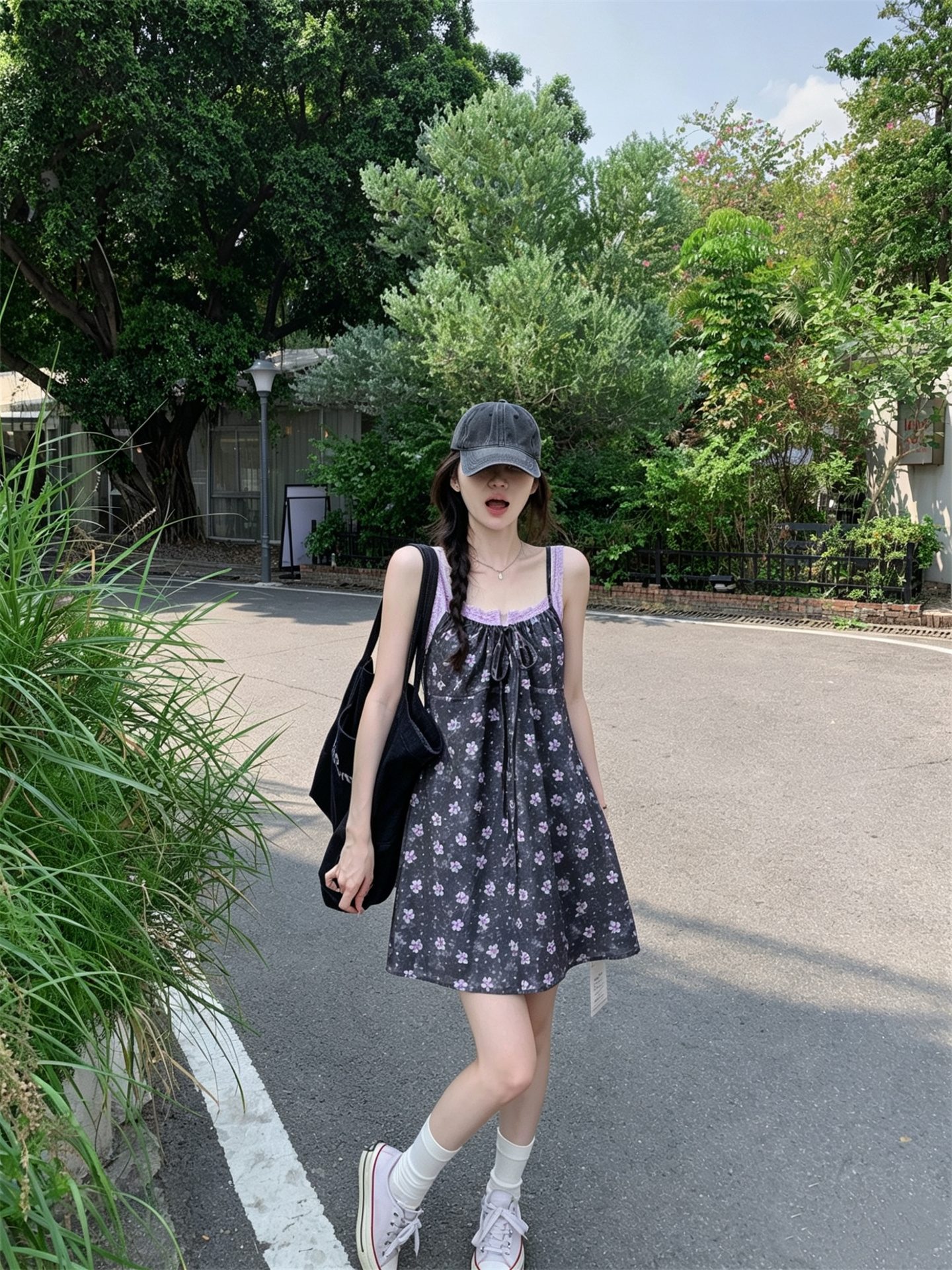 실사 정가 달콤함 보라색 작은 꽃무늬 슬립 민소매 조끼 원피스