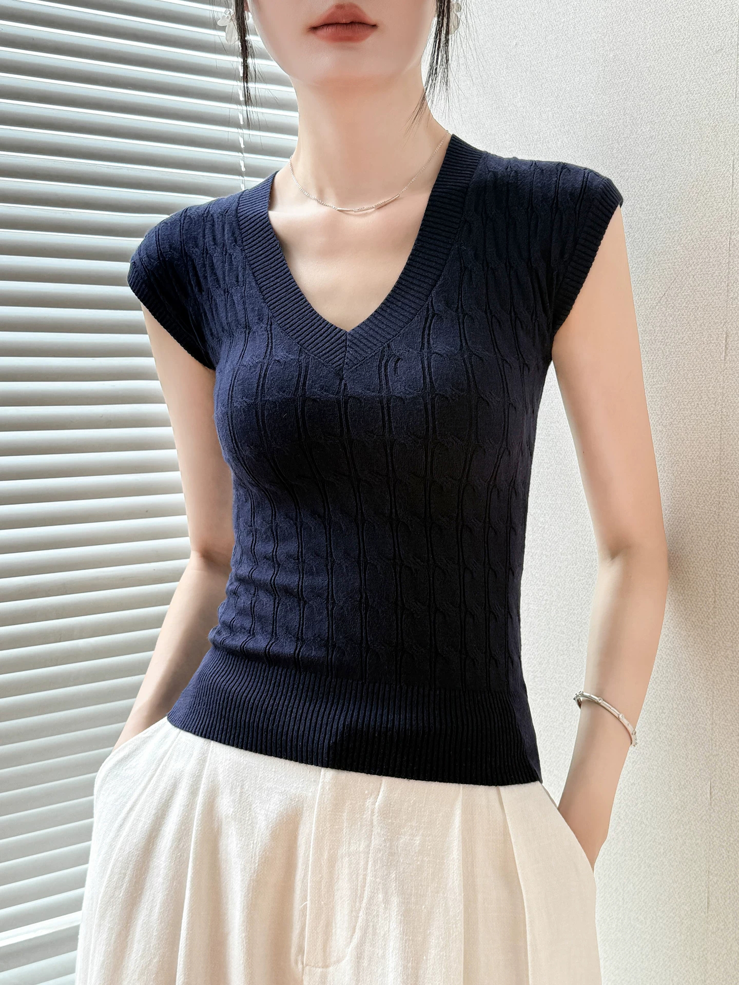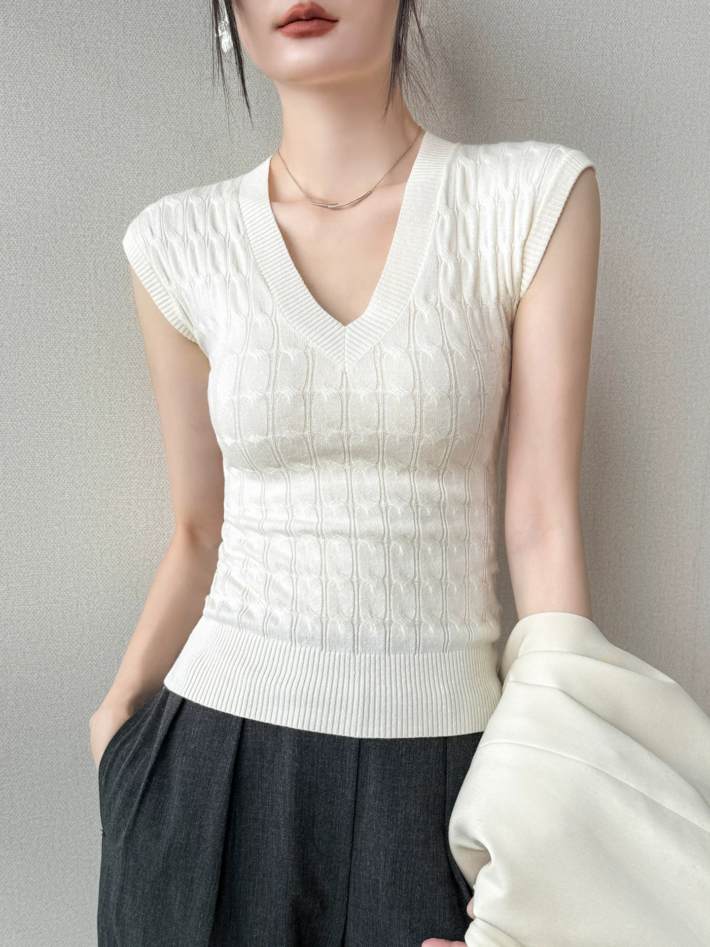 고유 한 어깨 민소매 니트 스웨터 조끼 여성 여름 디자인 센스 몸매 가꾸기 miu 부서 V넥 맨위 여성 만나는 인사이드 가져 가라.