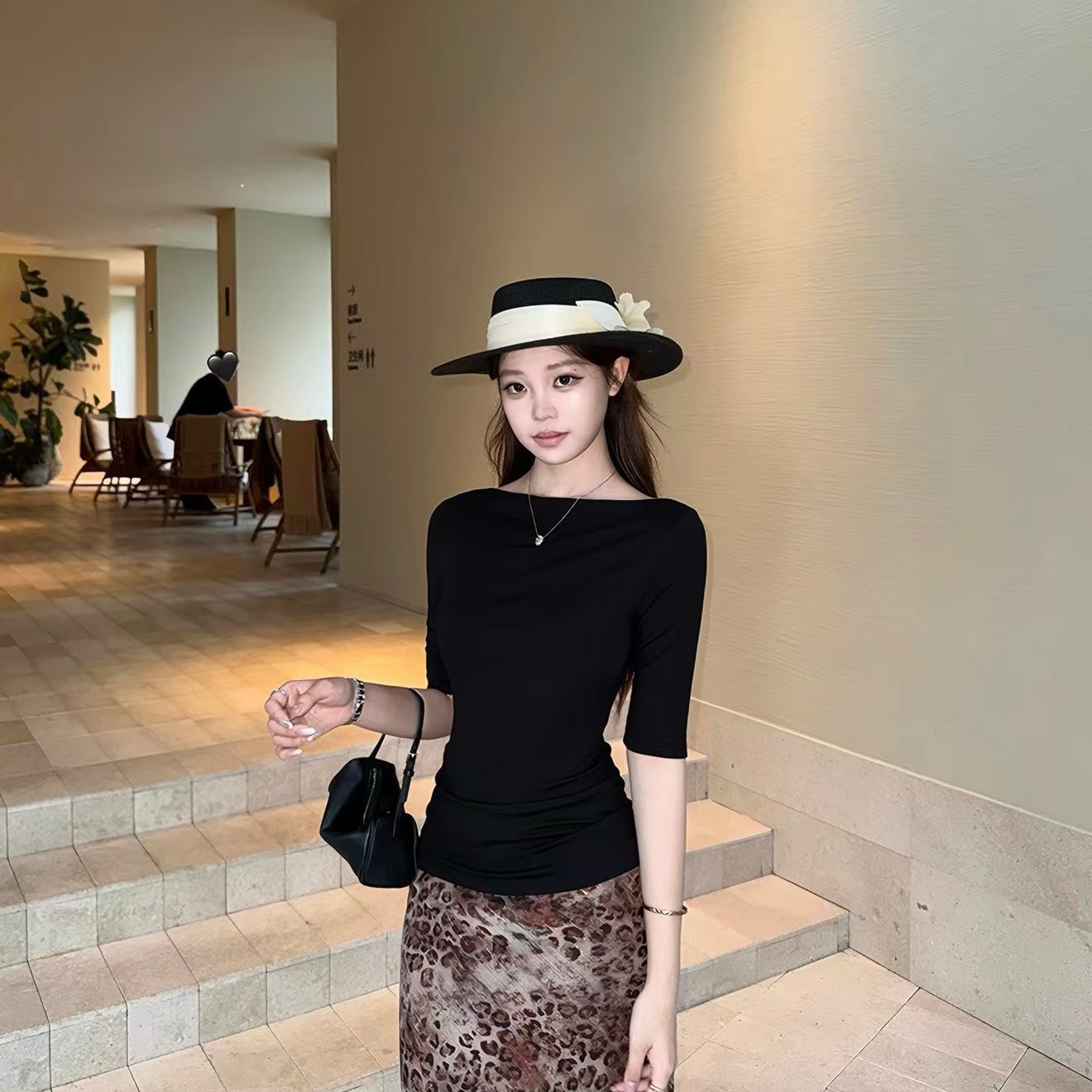 8uioio 하트 비트 표시 검정색 u 칼라 행침 목 티셔츠 여성 여름 새로운 오프숄더 디자인 센스 슬림해 보이는 짧은 맨위