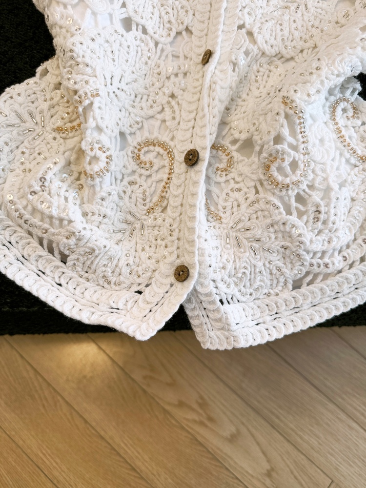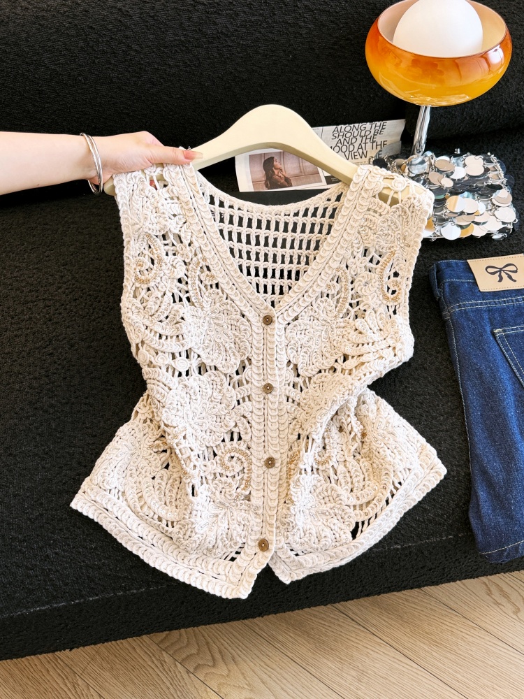 실사 프랑스식 홀로우 아웃 자수 술 V넥 니트 베스트 조끼 여성 여름 외국 가스 스택 착용 맨위