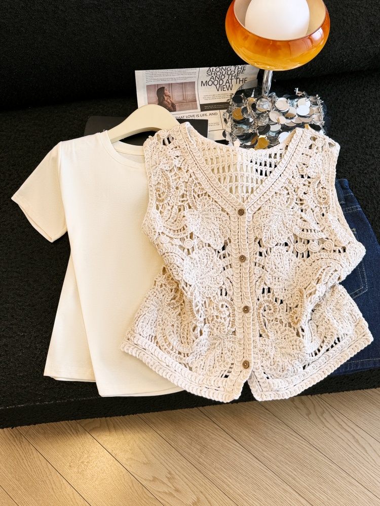 실사 프랑스식 홀로우 아웃 자수 술 V넥 니트 베스트 조끼 여성 여름 외국 가스 스택 착용 중 반팔 맨위