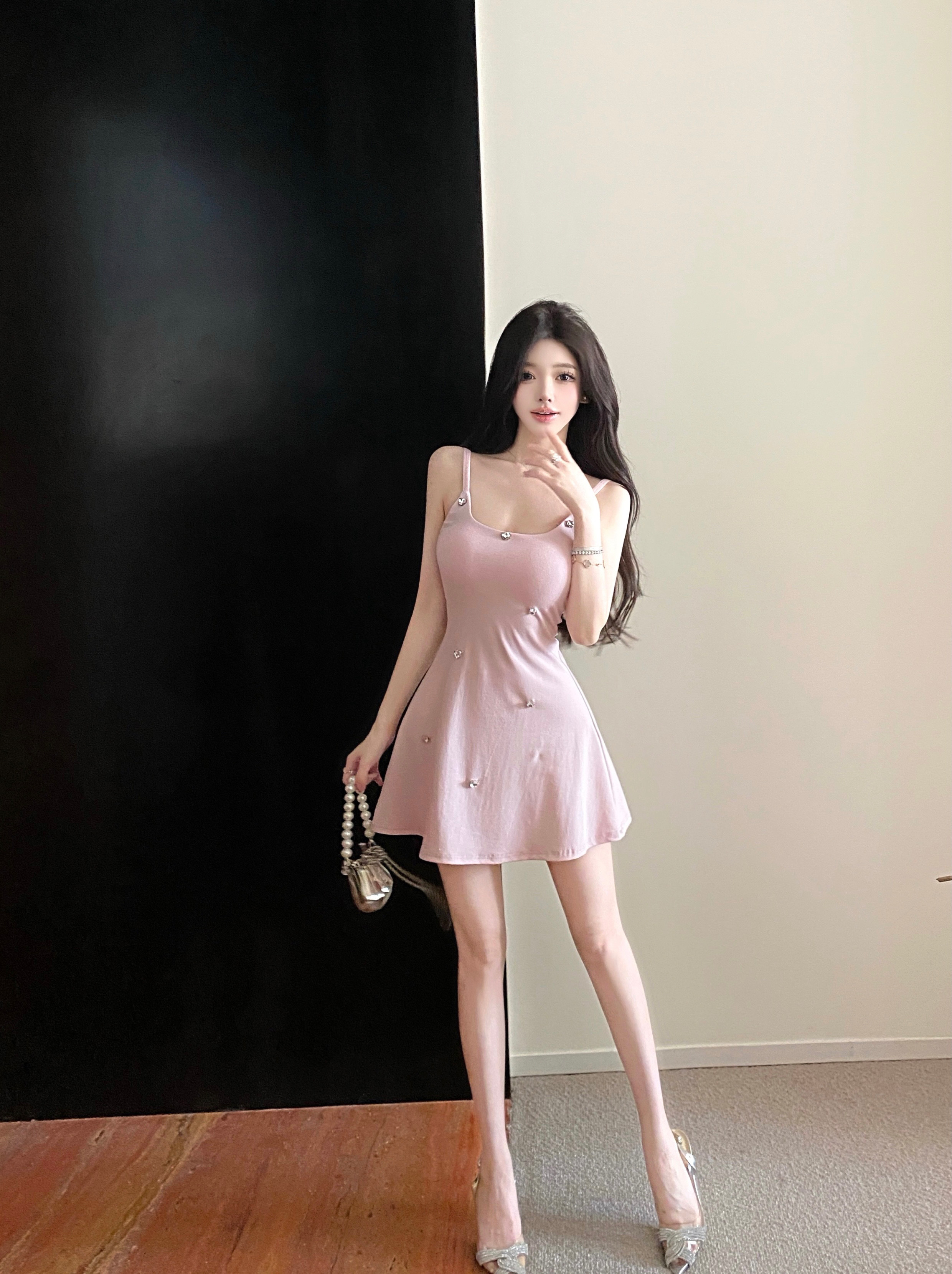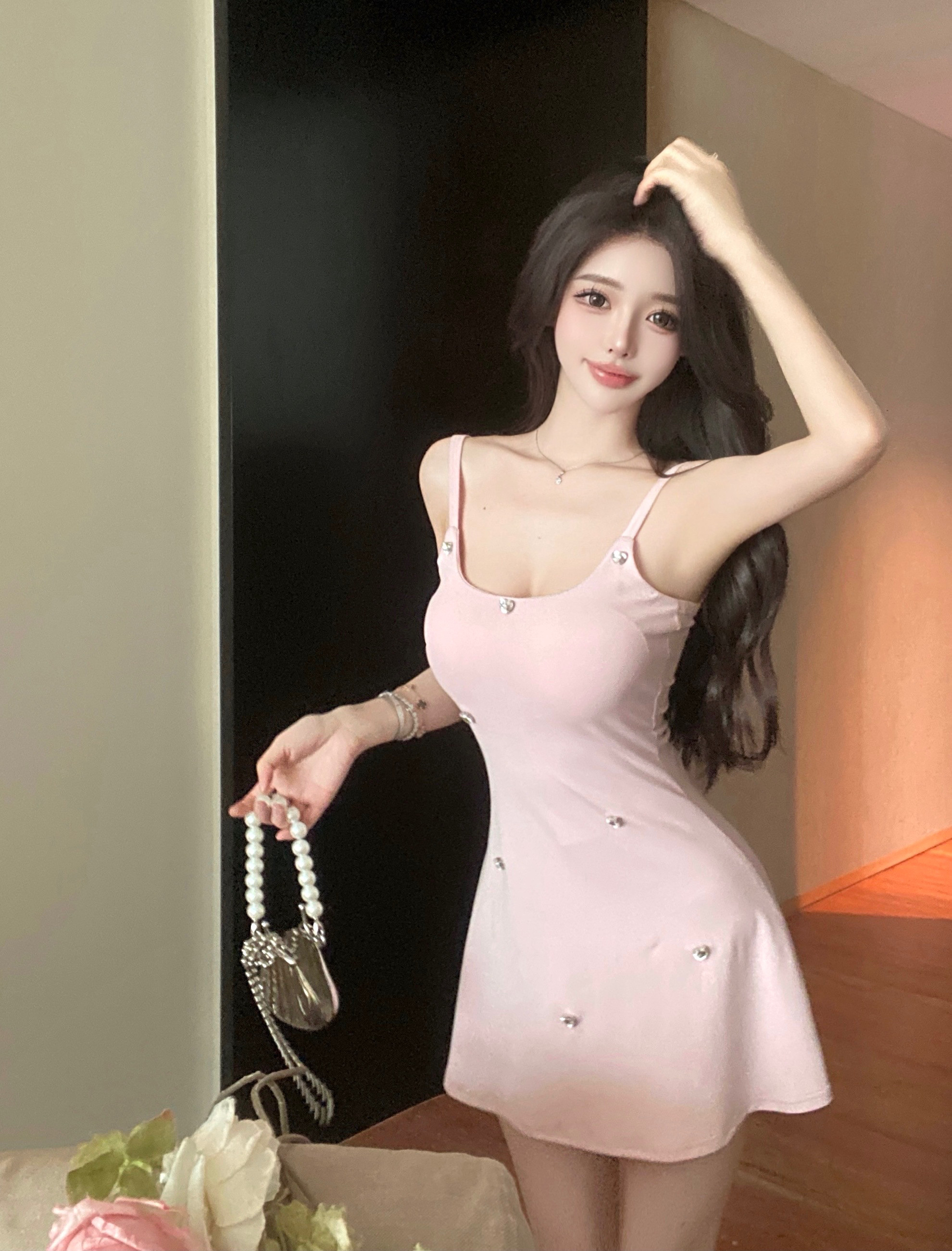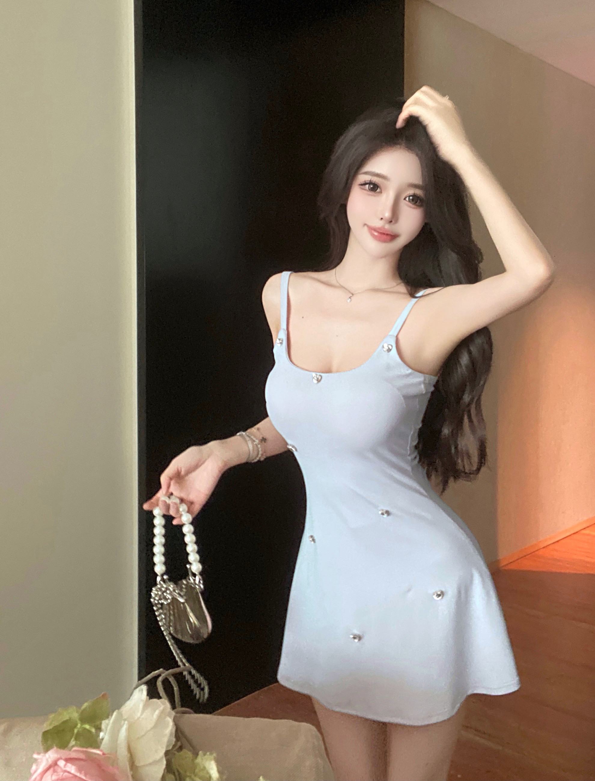 실사 핫걸 품격 섹시함 슬립 여성 드레스 여름 무거운 작업 다이아몬드 세팅 u 칼라 슬림해 보이는 허리 수축 한 마디 공주 드레스