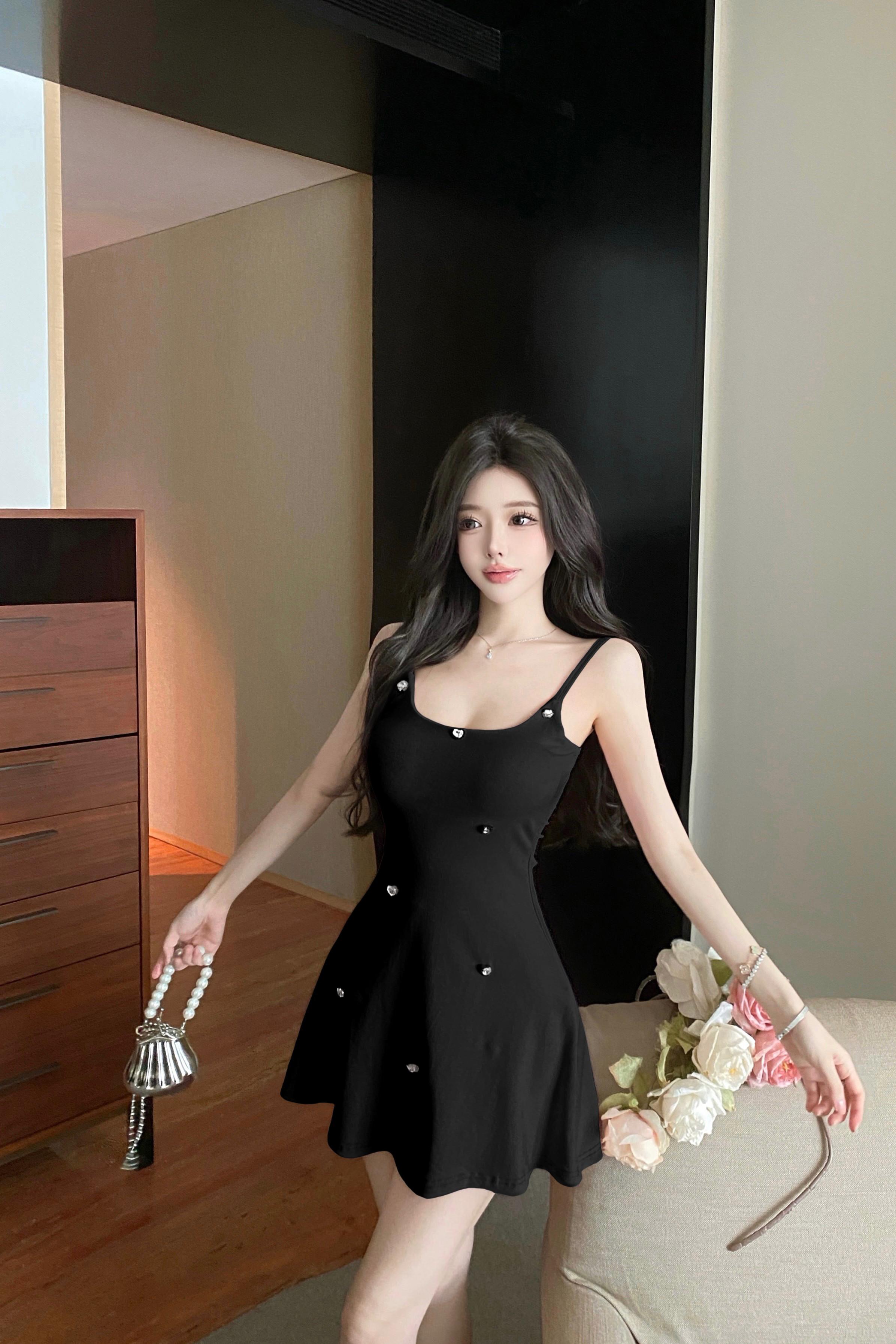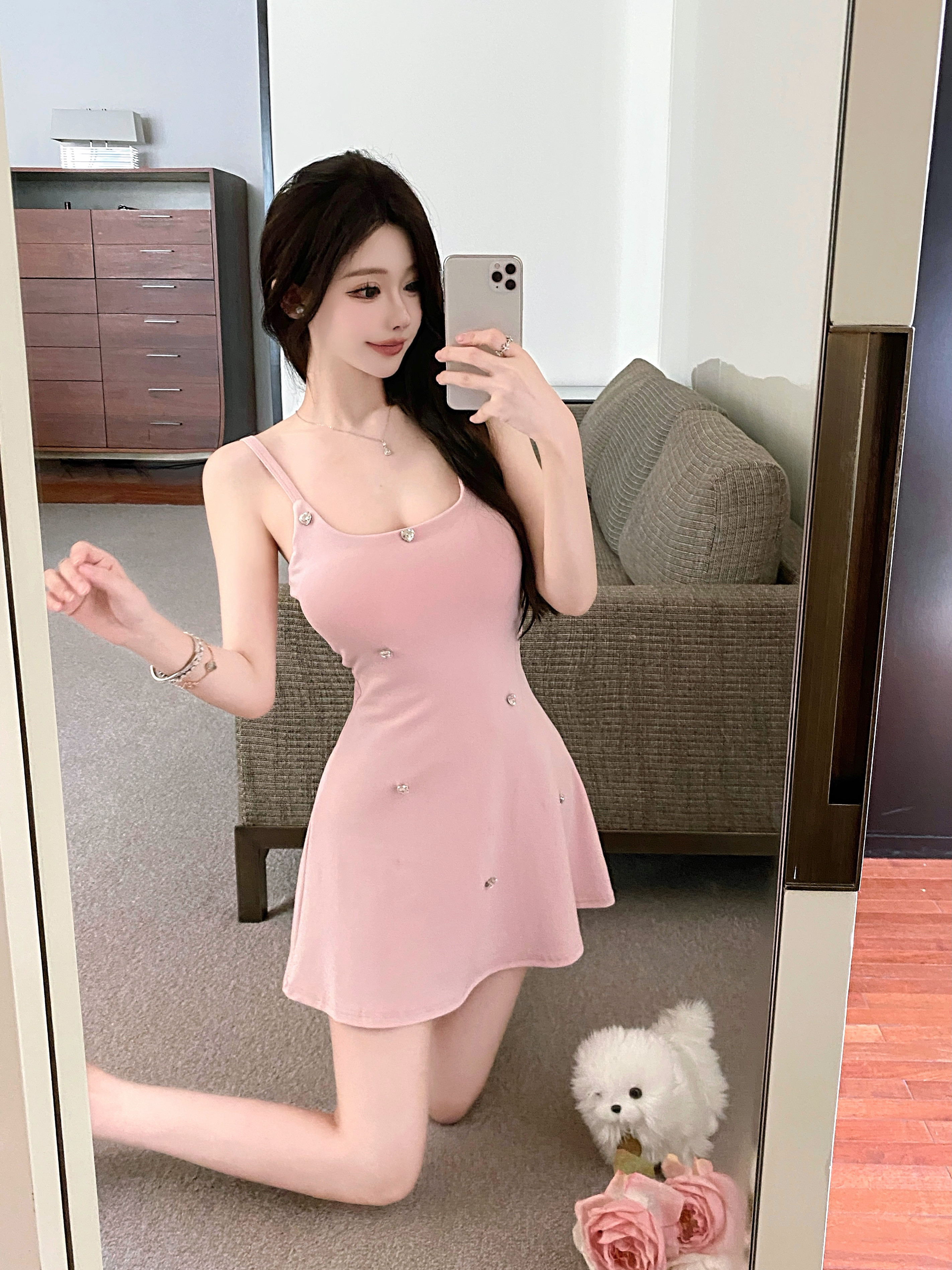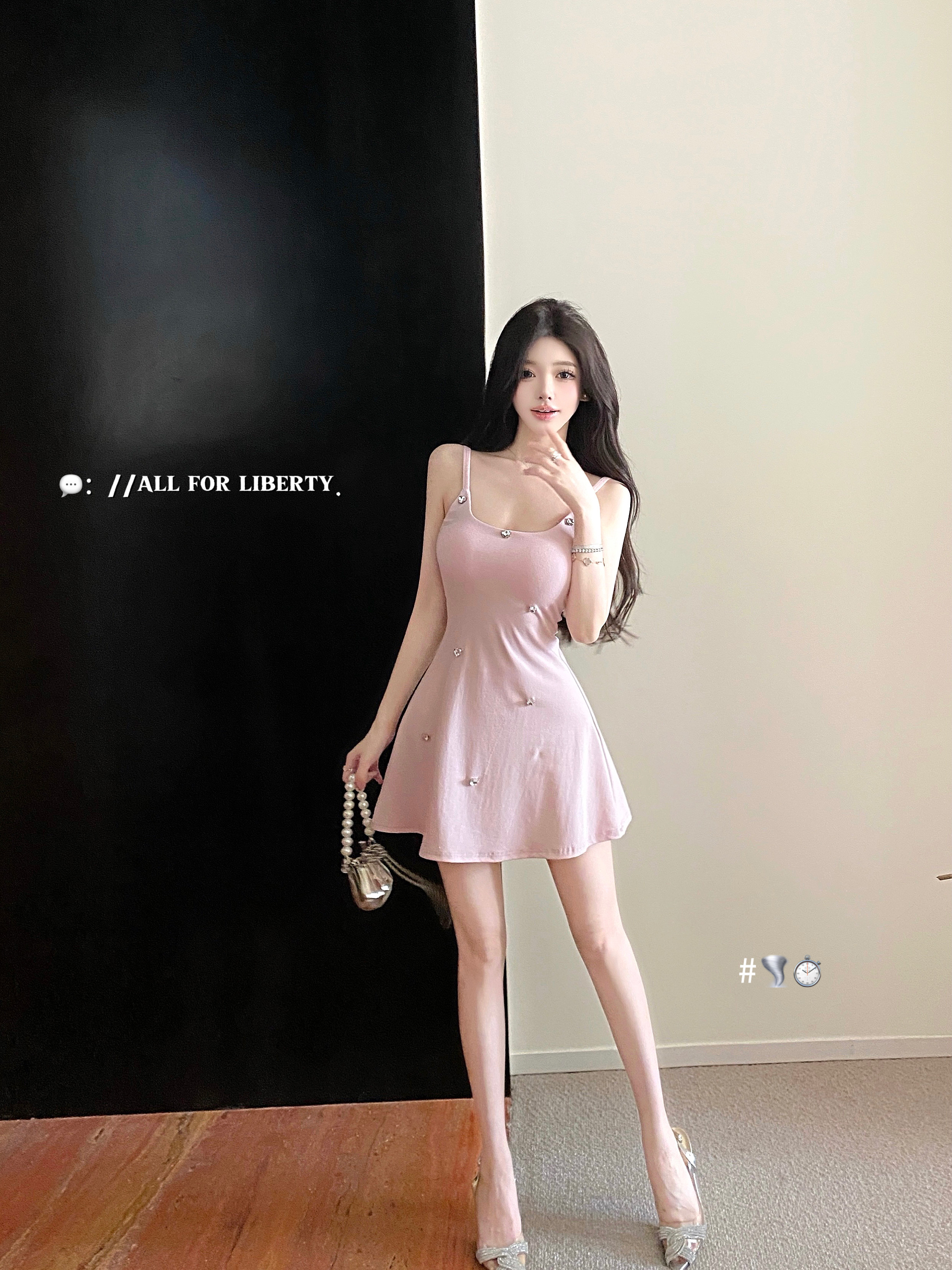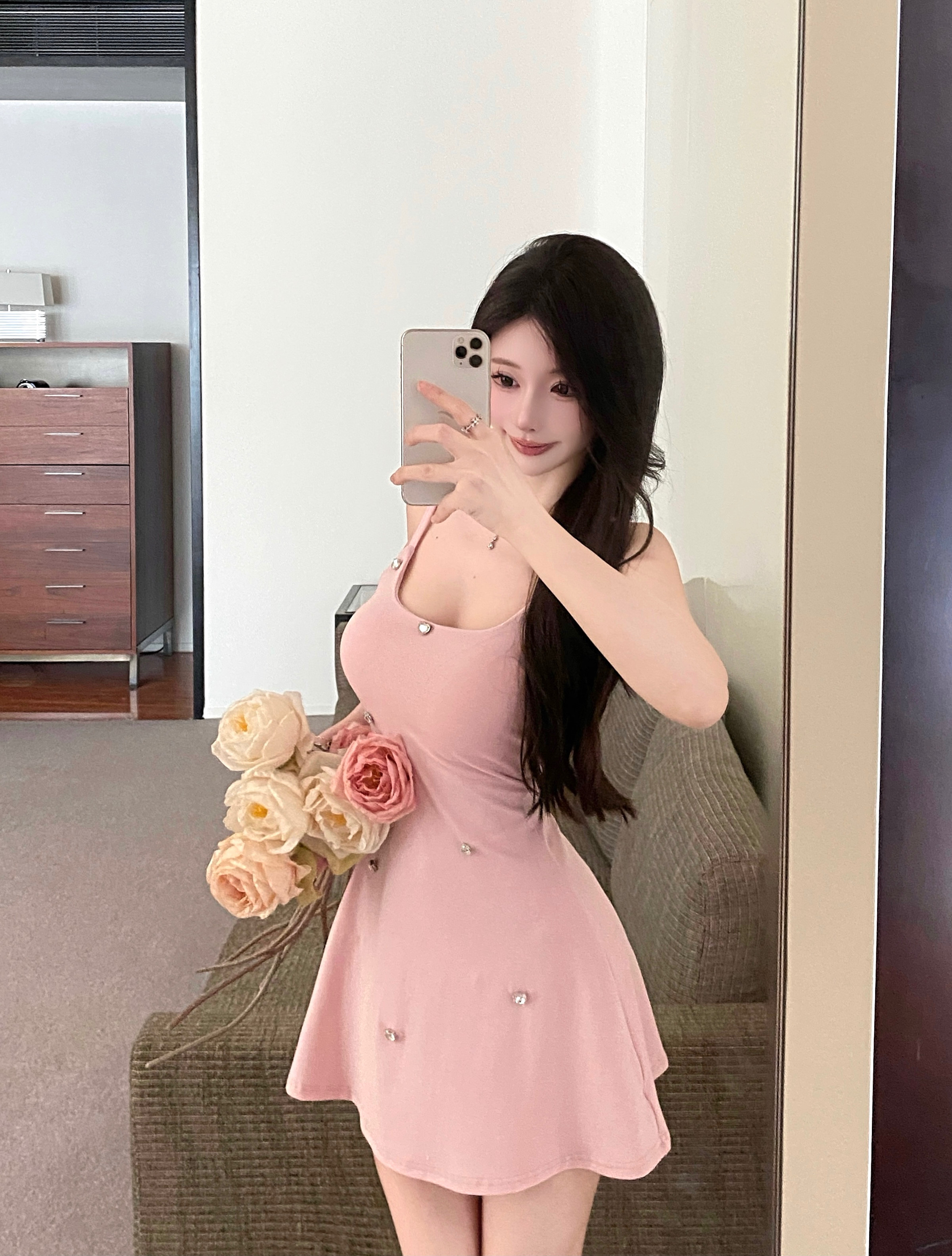 실사 핫걸 품격 섹시함 슬립 여성 드레스 여름 무거운 작업 다이아몬드 세팅 u 칼라 슬림해 보이는 허리 수축 한 마디 공주 드레스