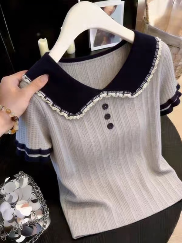 2026 여름 새로운 여성 레이스 베이비 칼라 반팔 회색 니트 티셔츠 부드러운 바람 달콤함 다용도 맨위