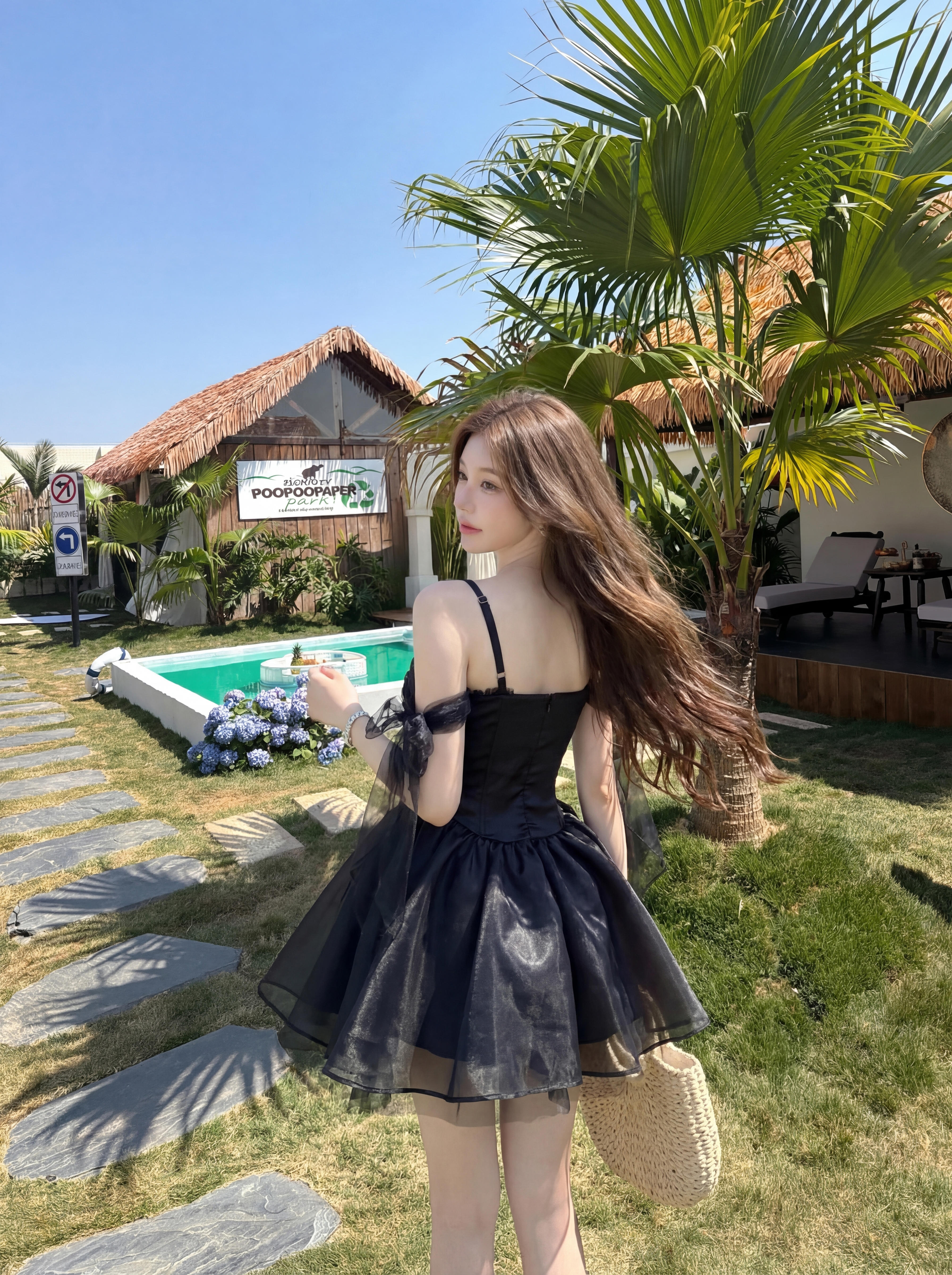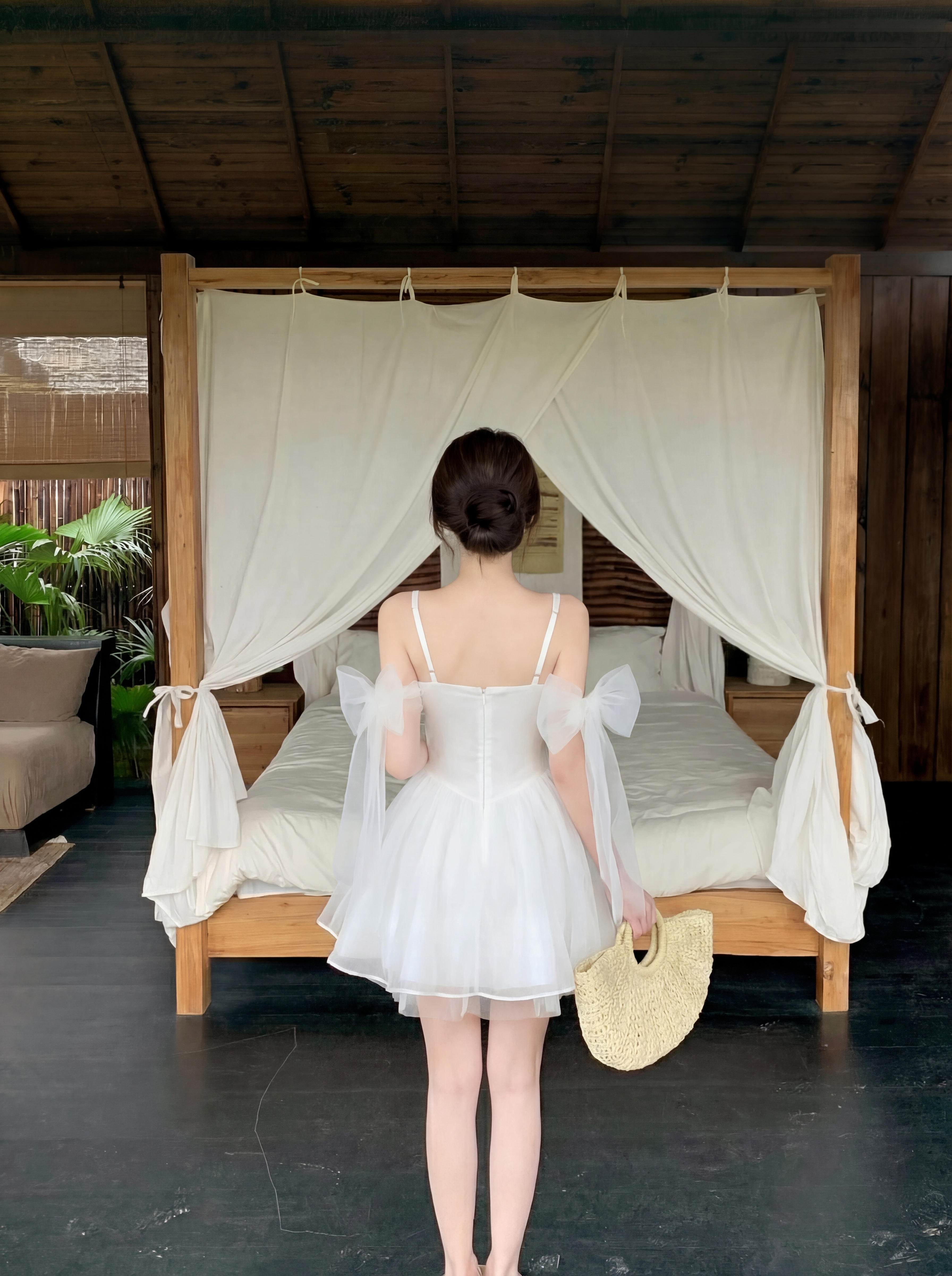 실사 달콤한 매운맛 공주 예복 순수한 욕망 발레 바람 한 마디 퍼프 미니 스커트 오프숄더 슬립 허리 수축 여성 드레스