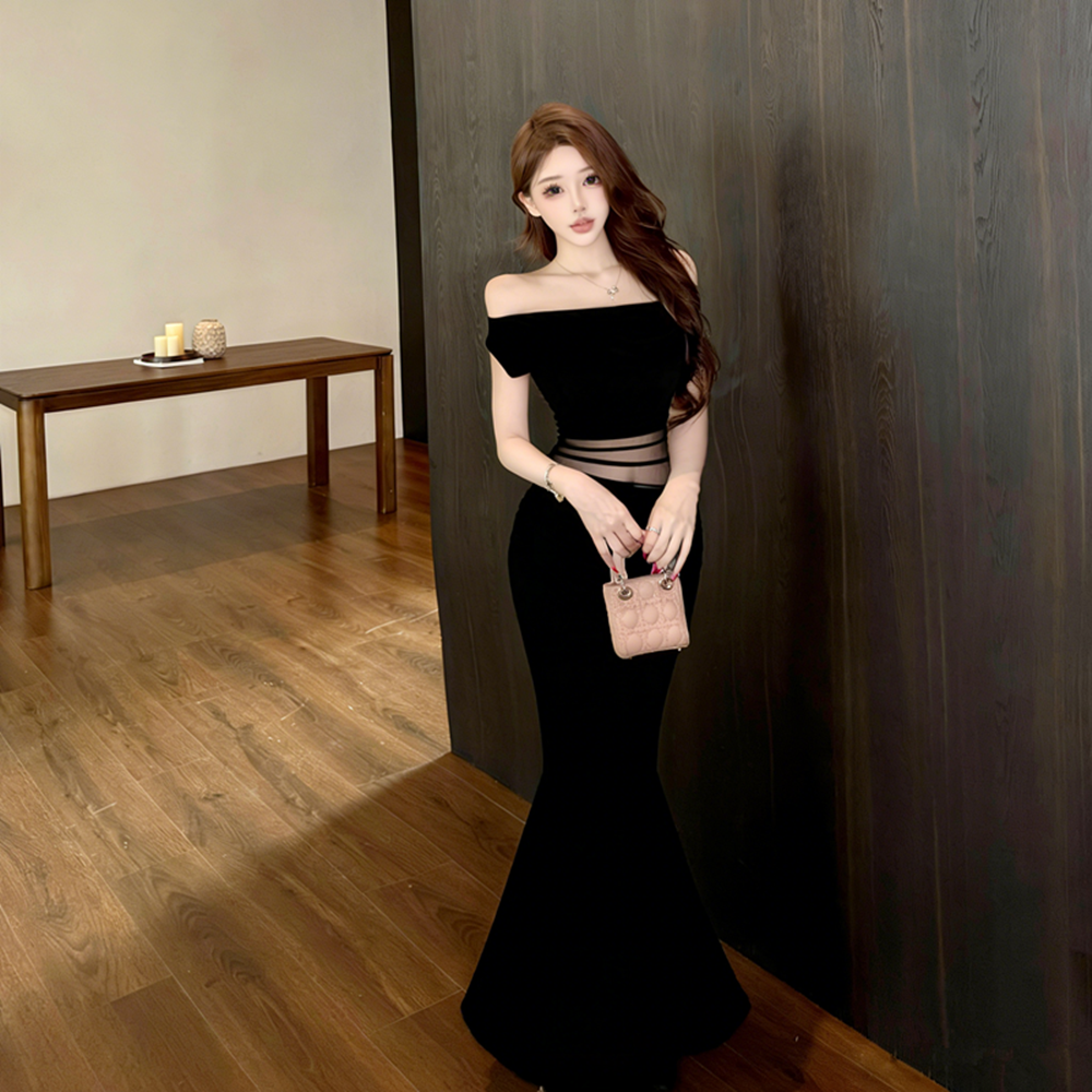 실사 핫걸 순수한 욕망 바람 오프숄더 드레스 디자인 센스 망사 시스루 품격 아름다운 허리 수축 타이트 스커트 롱 스커트