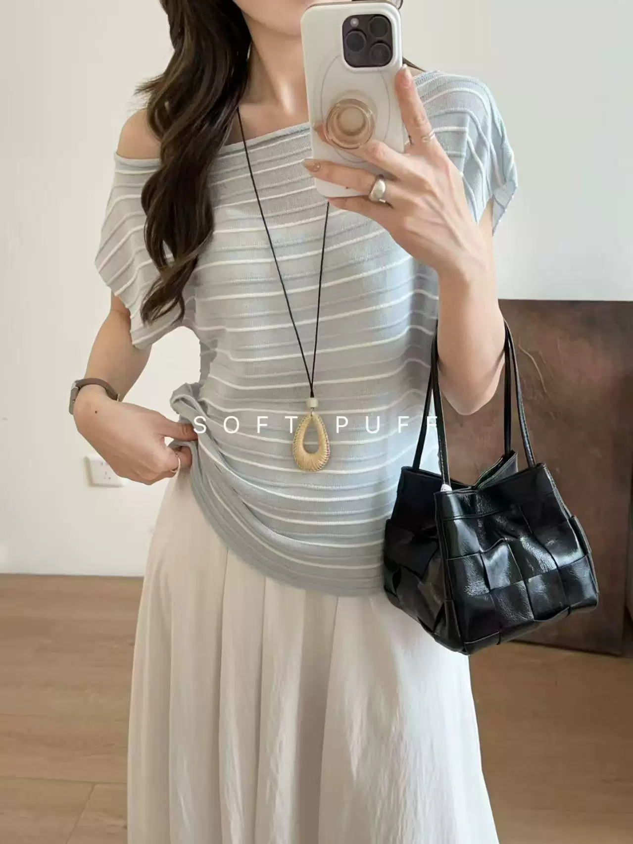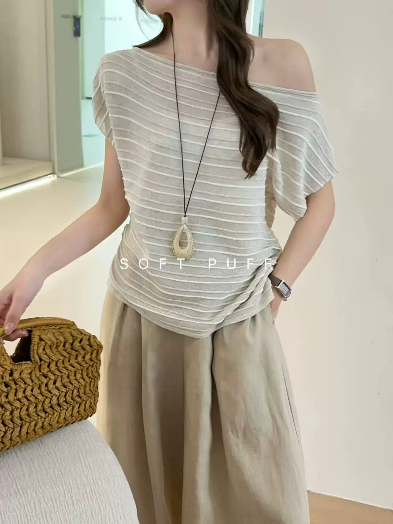 한 스타일 스트라이프 오프숄더 반팔 티셔츠 여성 몸매 가꾸기 슬림해 보이는 오프숄더 다용도 맨위 학원 스타일 스트라이프 맨위 여성