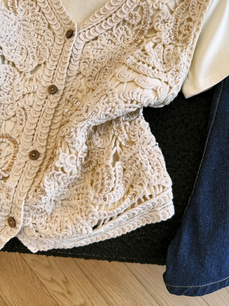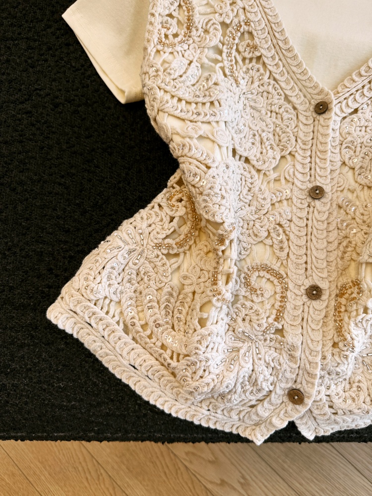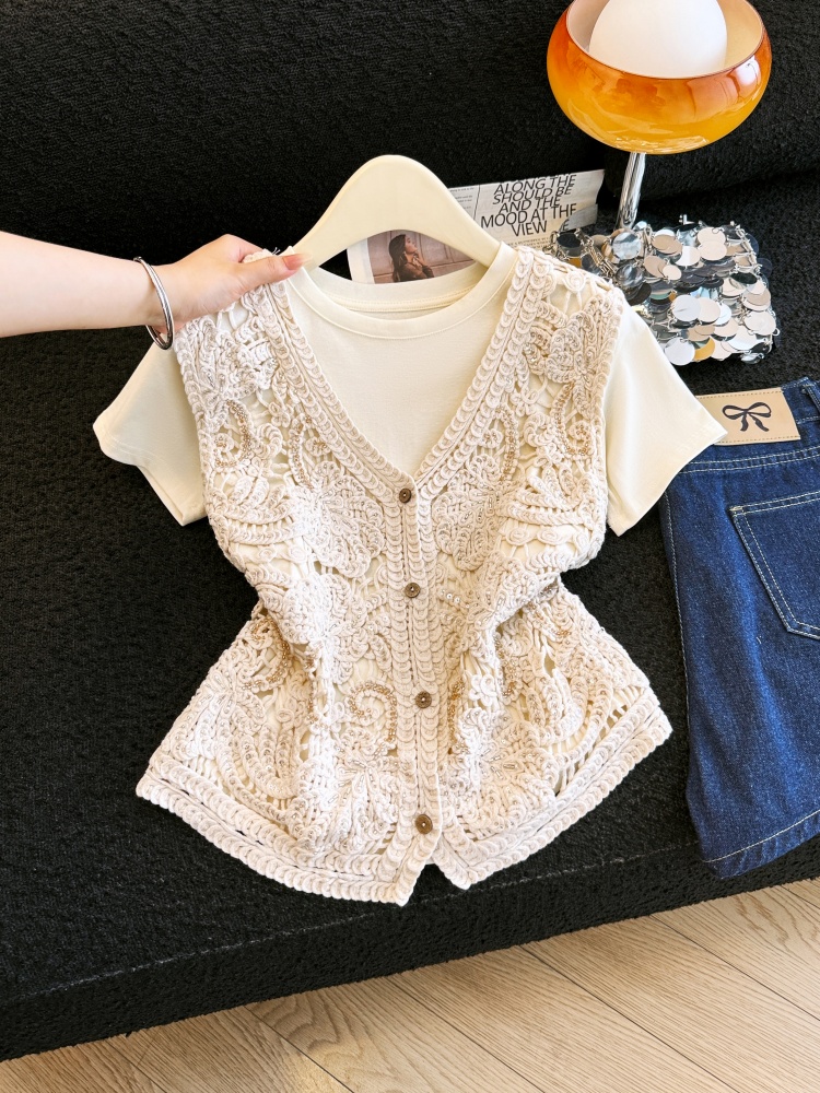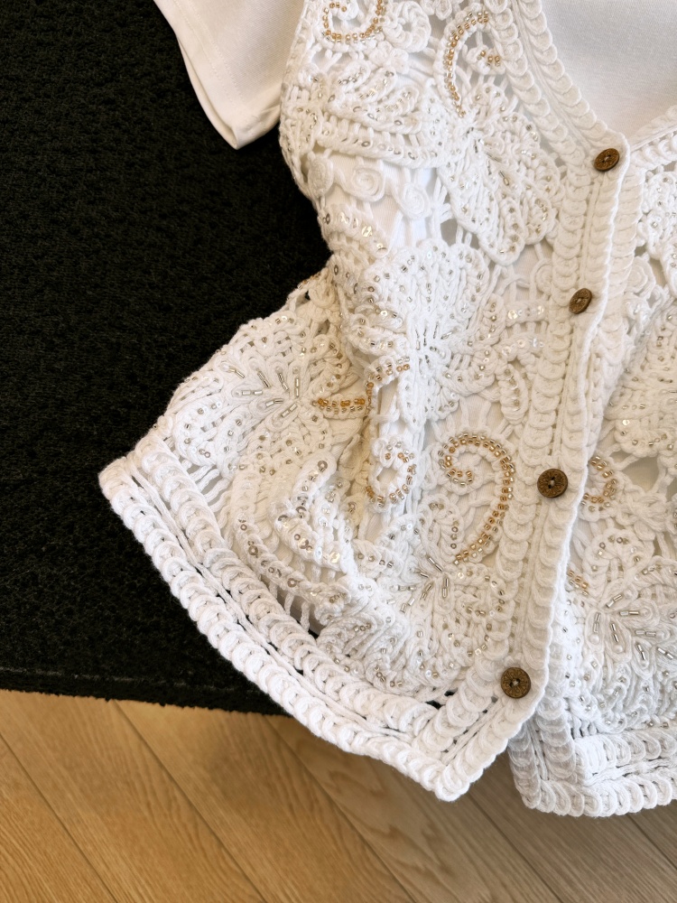 실사 프랑스식 홀로우 아웃 자수 술 V넥 니트 베스트 조끼 여성 여름 외국 가스 스택 착용 중 반팔 맨위