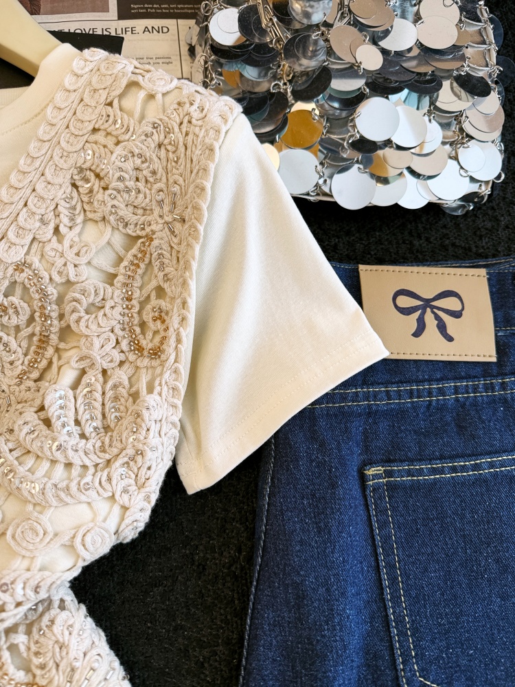 실사 여름 새로운 자수 홀로우 아웃 무거운 작업 구슬 조각 자수 레이스 베스트 다용도 반팔 티셔츠 투피스 슈트