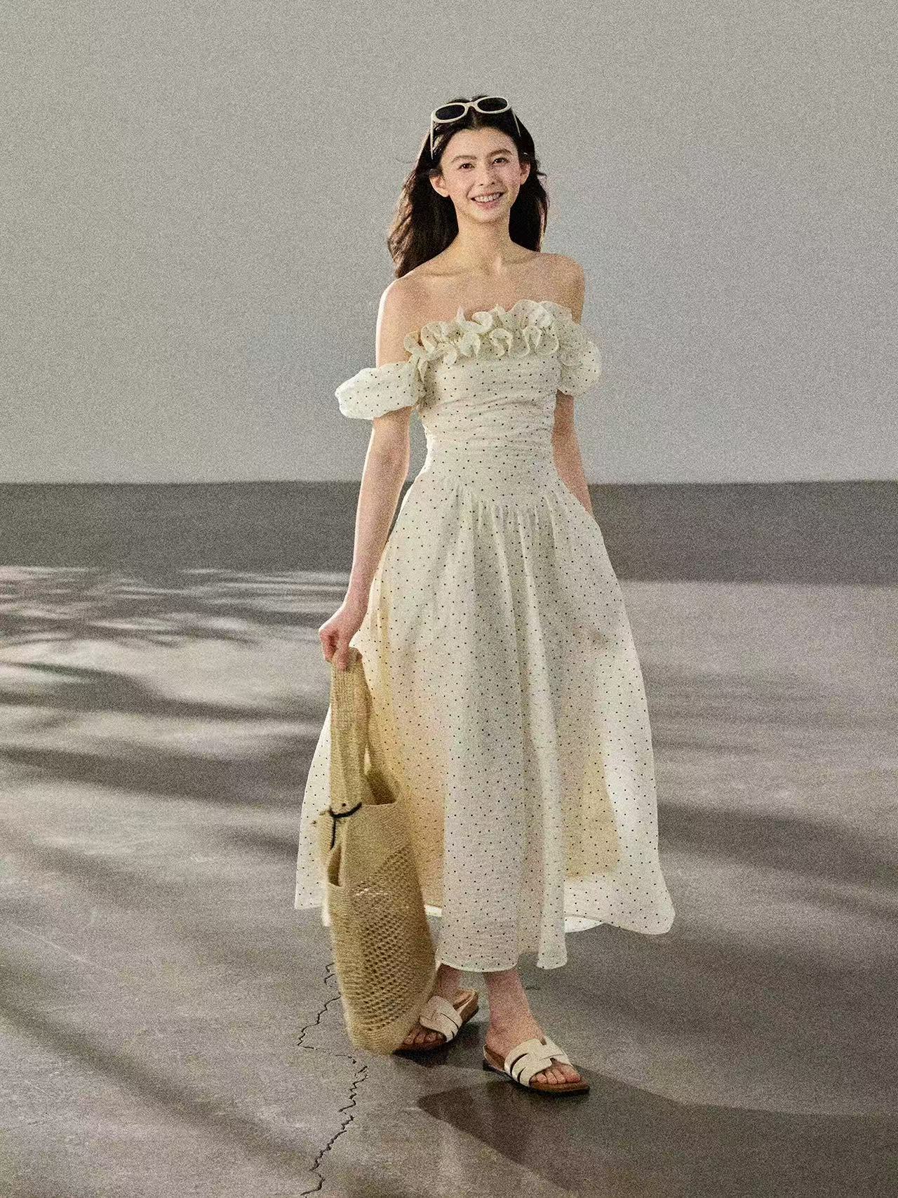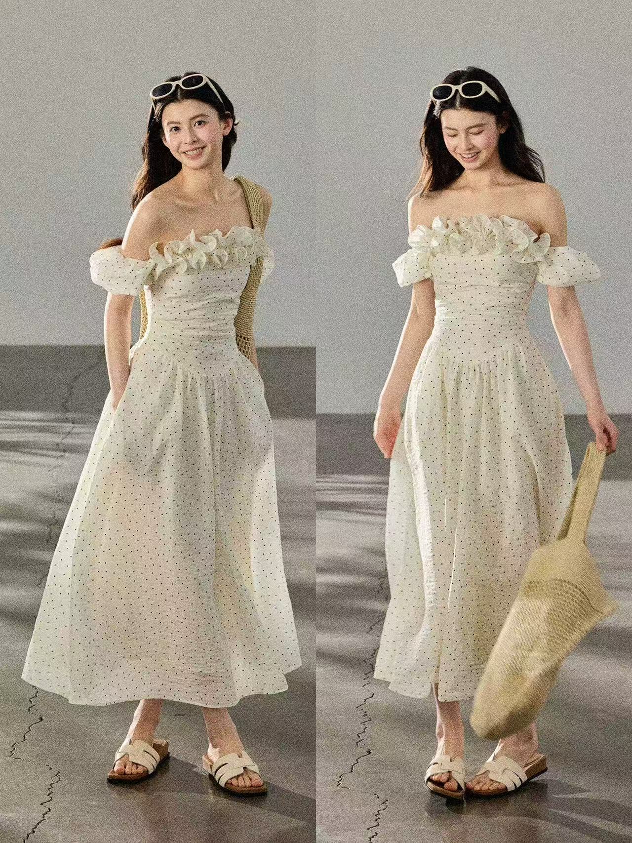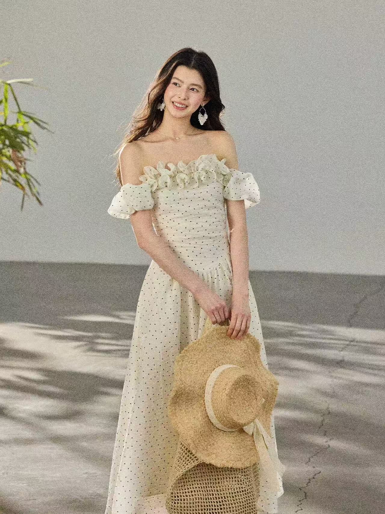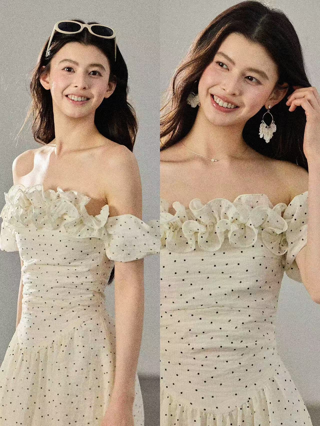 둘 착용 3 차원 프릴 오프숄더 레트로 도트 무늬 여성 드레스 허리 수축 롱 스커트