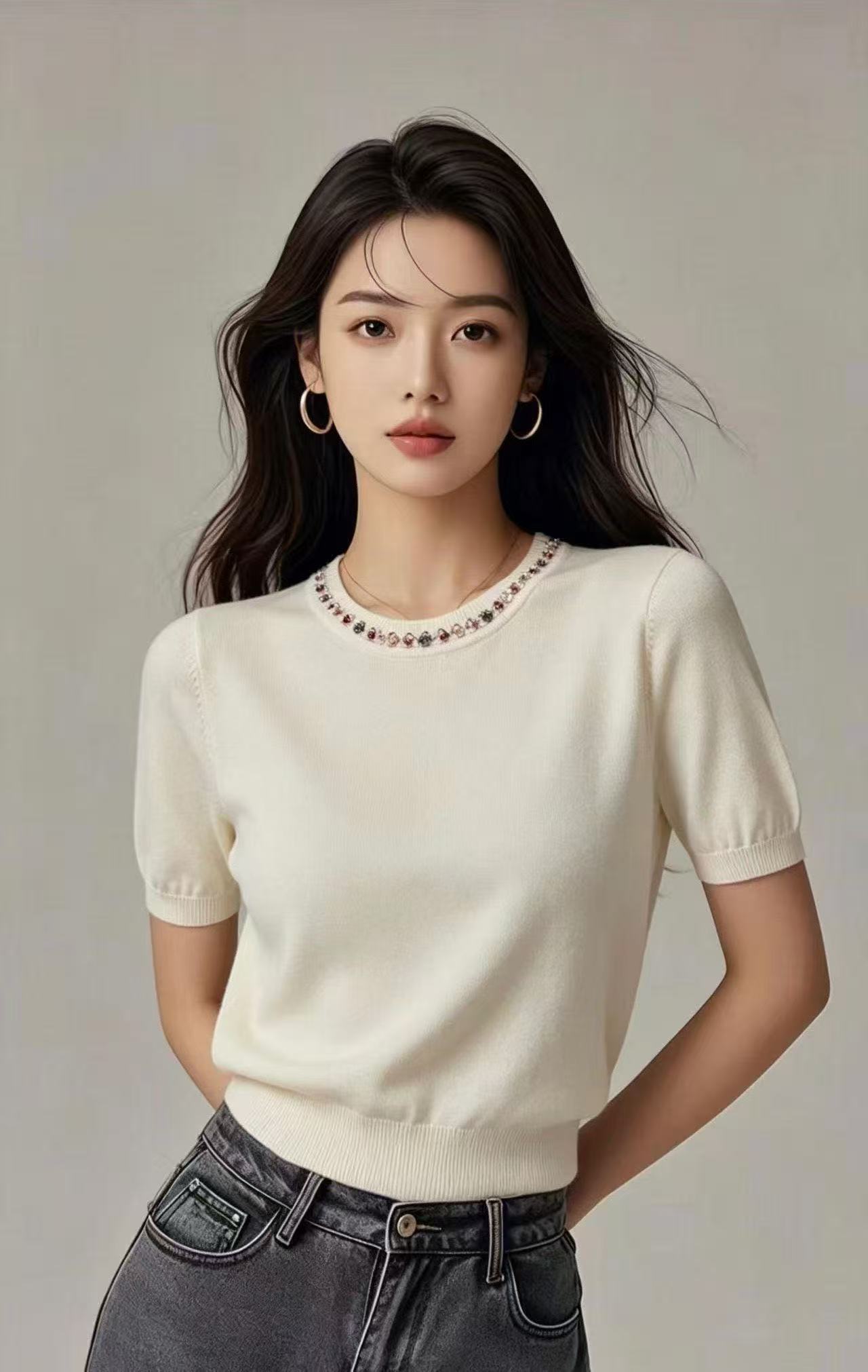 디자인 센스 비즈 박기 장식 라운드 넥 반팔 티셔츠 니트 스웨터 여성 의류 다용도 느슨함 센스 맨위 품격 기본 셔츠