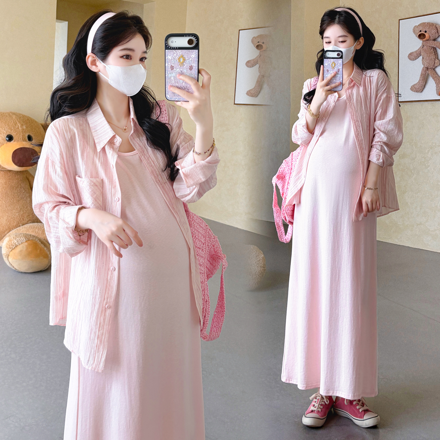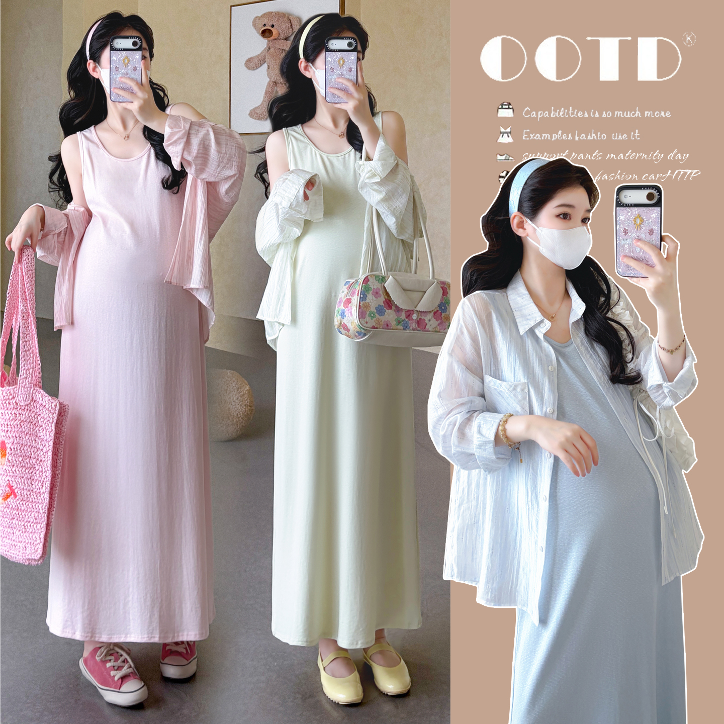 실사 출산 착용 여름 드레스 패션 임산부 드레스 루즈핏 중간 길이 멜빵 치마 세트 외국 가스 트렌디 엄마 반팔