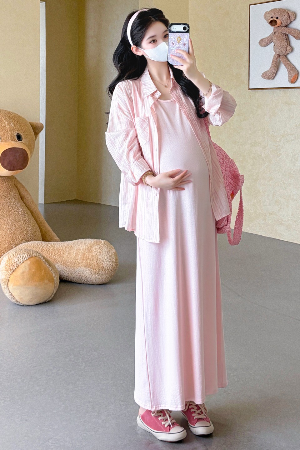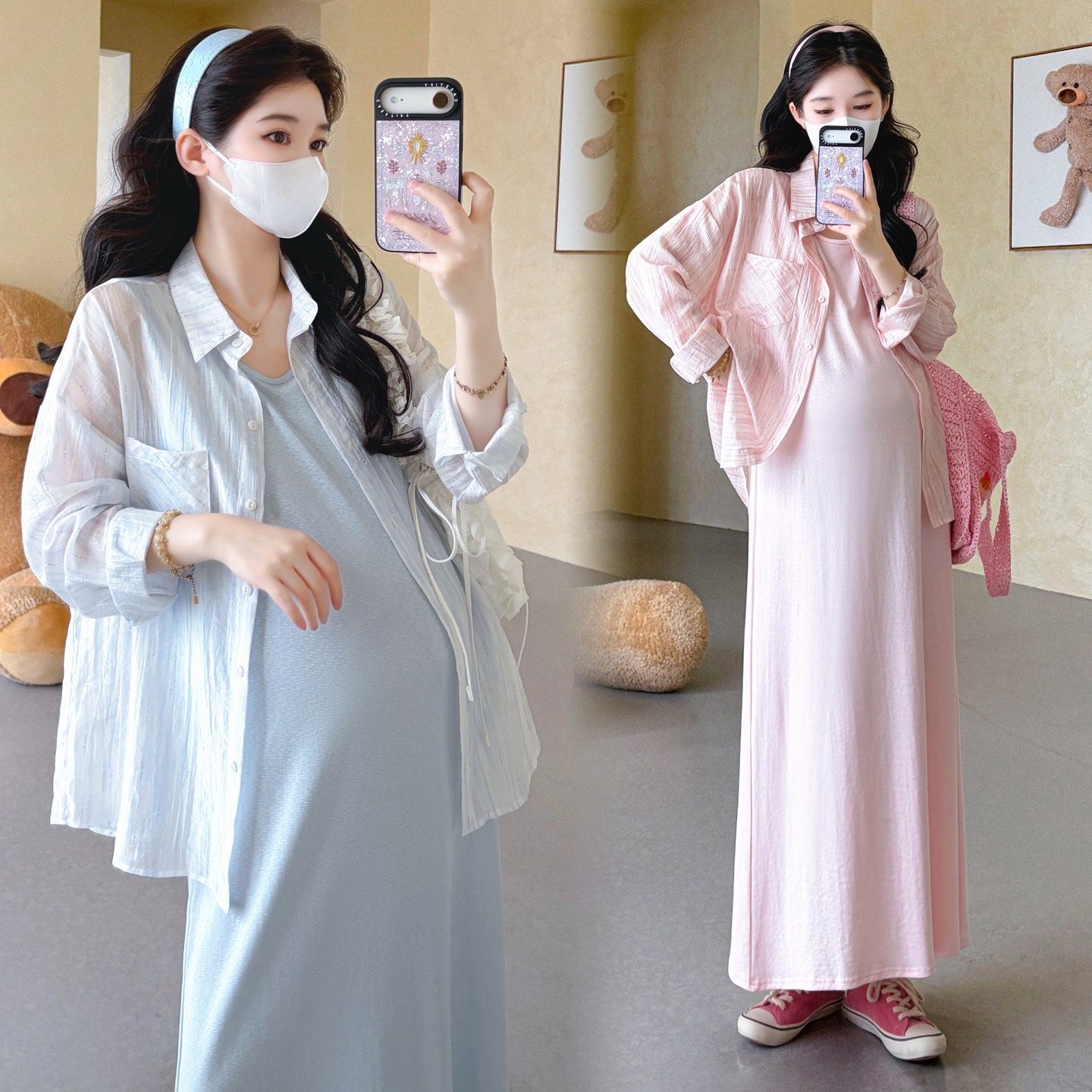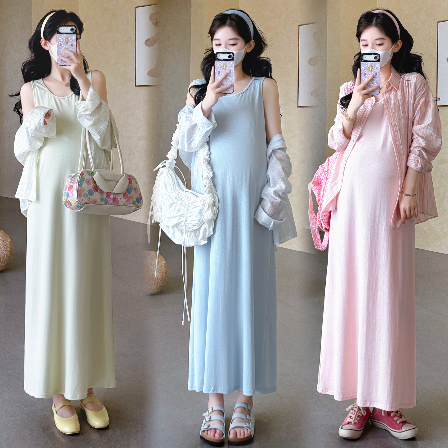 실사 2026 여름 새로운 임산부 조끼 원피스 라운드 넥 맨위 투피스 세트 루즈핏 표지 고기 세트