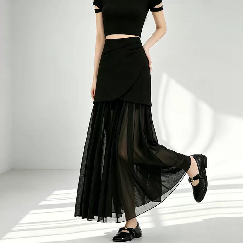 yy ・ studio 스파이크 흔적 약탈 란 2026 여름 검정색 술 하이웨이스트 슬림해 보이는 롱 코트 반신 스커트